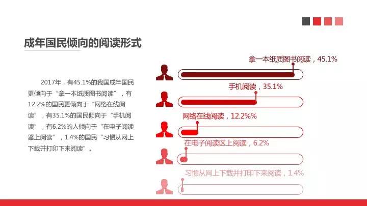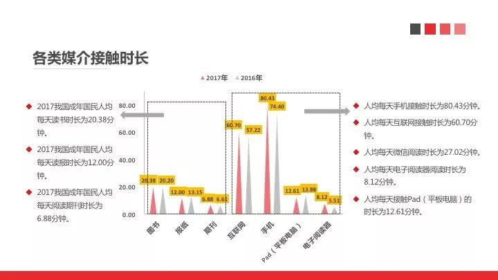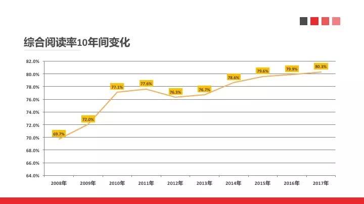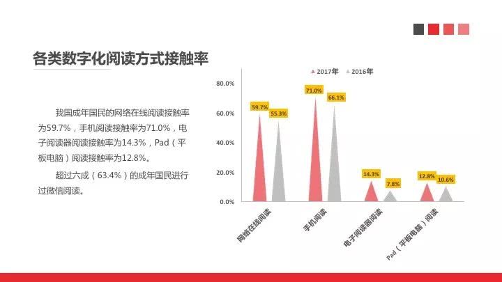 一、2017年我国成年国民各媒介综合阅读率保持增长势头,数字化阅读方式的接触率和纸质图书阅读率均有所增长;