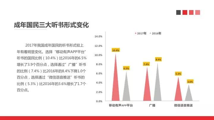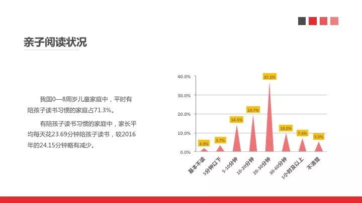 亮点在:0-17周岁未成年人图书阅读量保持增长,有声阅读成为国民阅读新的增长点,移动有声APP平台已经成为听书的主流选择;超过七成家庭有陪孩子读书的习惯。
