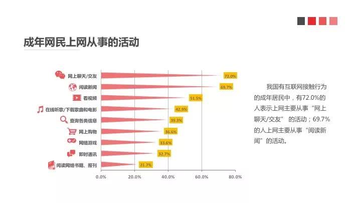 2017年,我国成年国民上网率为79.1%,比2016年的73.8%增加了5.3个百分点。具体来看,有四成左右(40.3%)的国民通过电脑上网,有近八成(77.9%)的国民通过手机上网。其中,通过手机上网的比例增幅明显,与2016年的72.6%相比,增长了5.3个百分点。