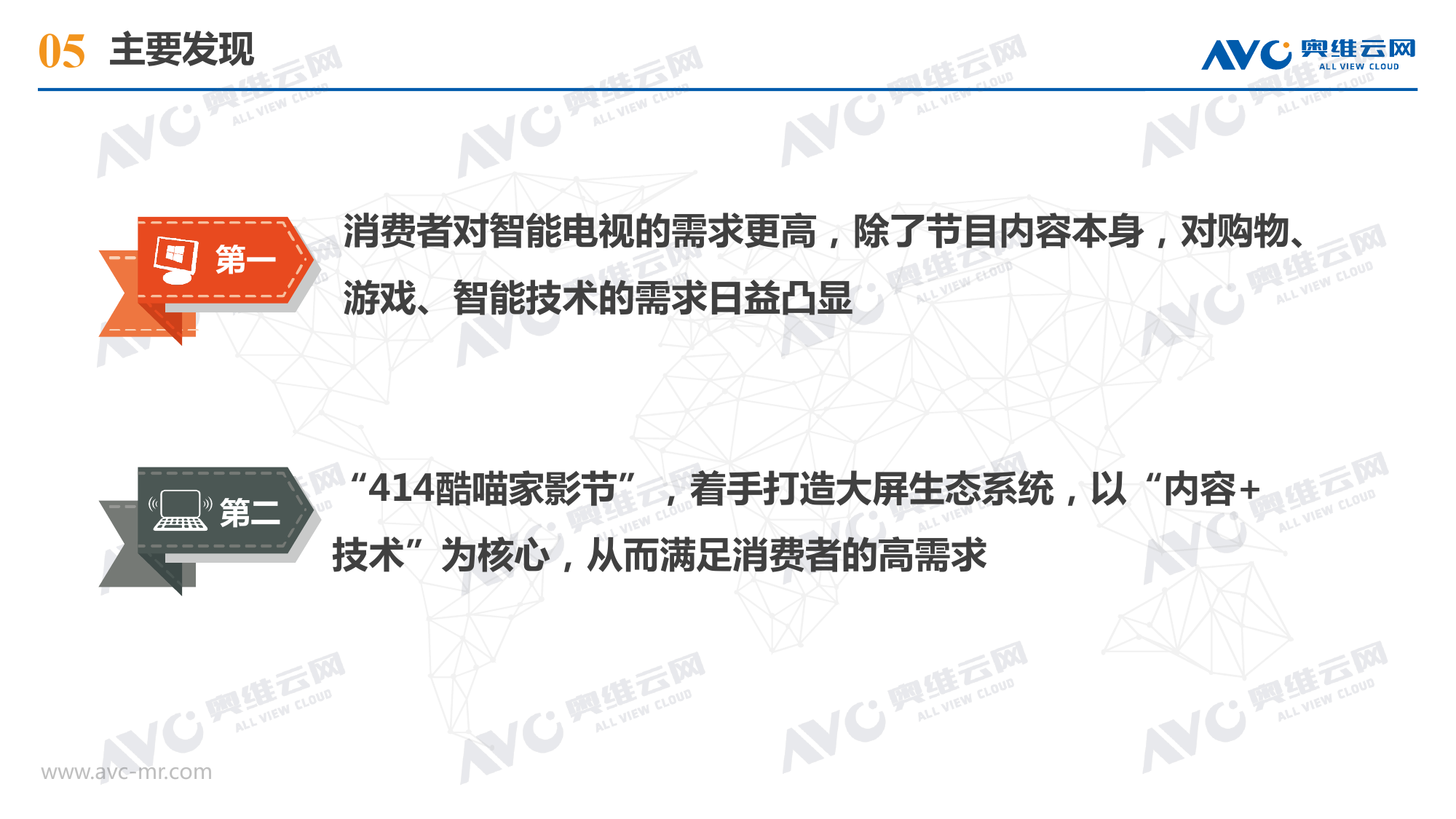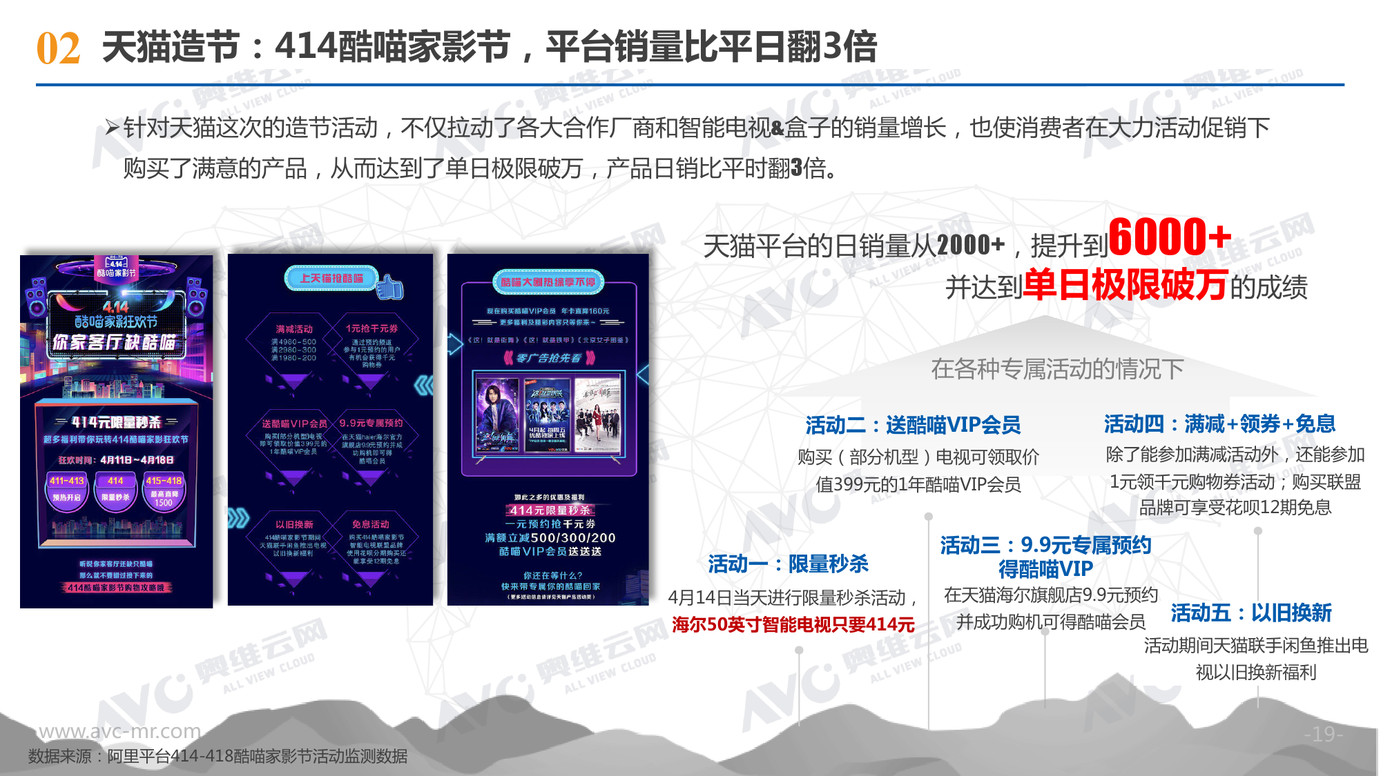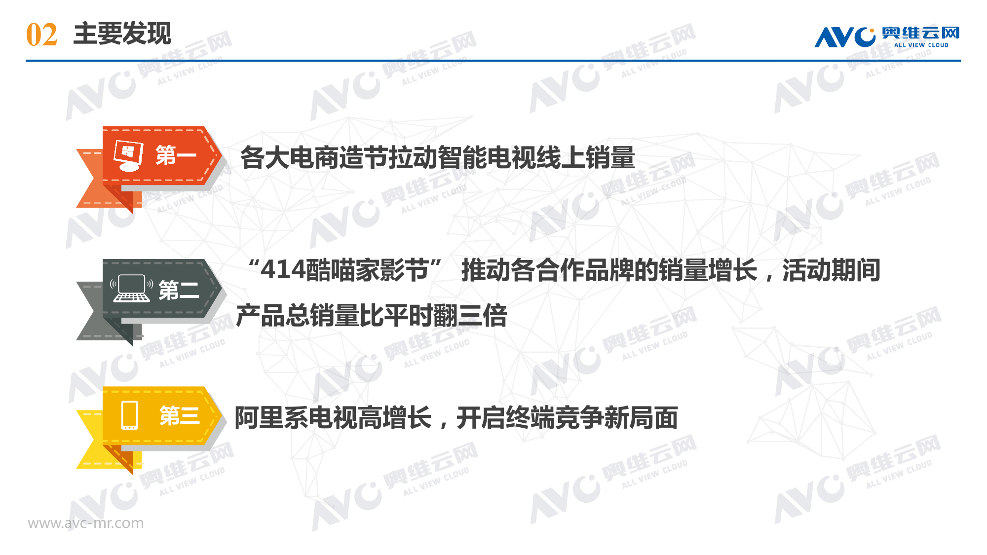 发现三:各大电商的造节活动拉动智能电视的线上销量。其中,天猫“414酷喵家影节”期间产品总销量比平时翻三倍