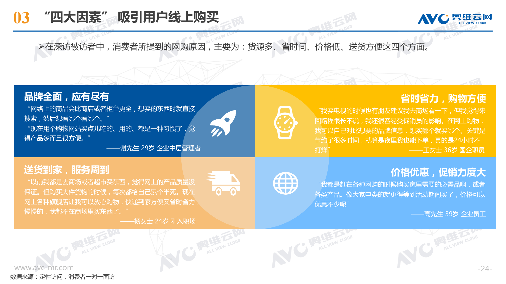 发现五:用户选择线下门店购物更看重其带来的参与感和体验感;选择线上电商购买认为网购省时、方便、有优惠