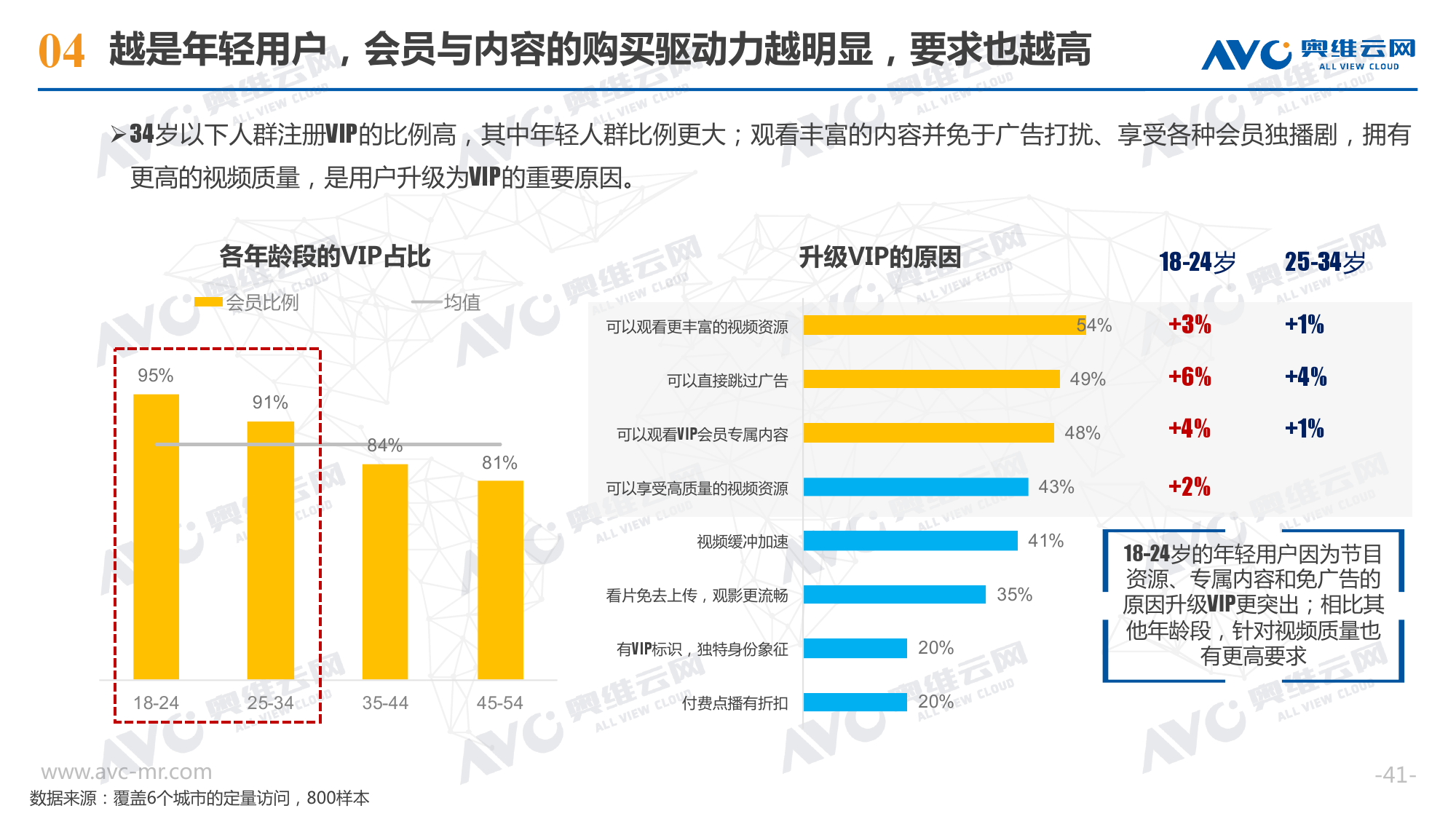 发现九:点播收看习惯的增加为会员付费打下良好基础。在18-24岁的年轻人群中,会员与内容的购买驱动力更为明显,他们对节目资源、专属内容等VIP权益的要求也更高