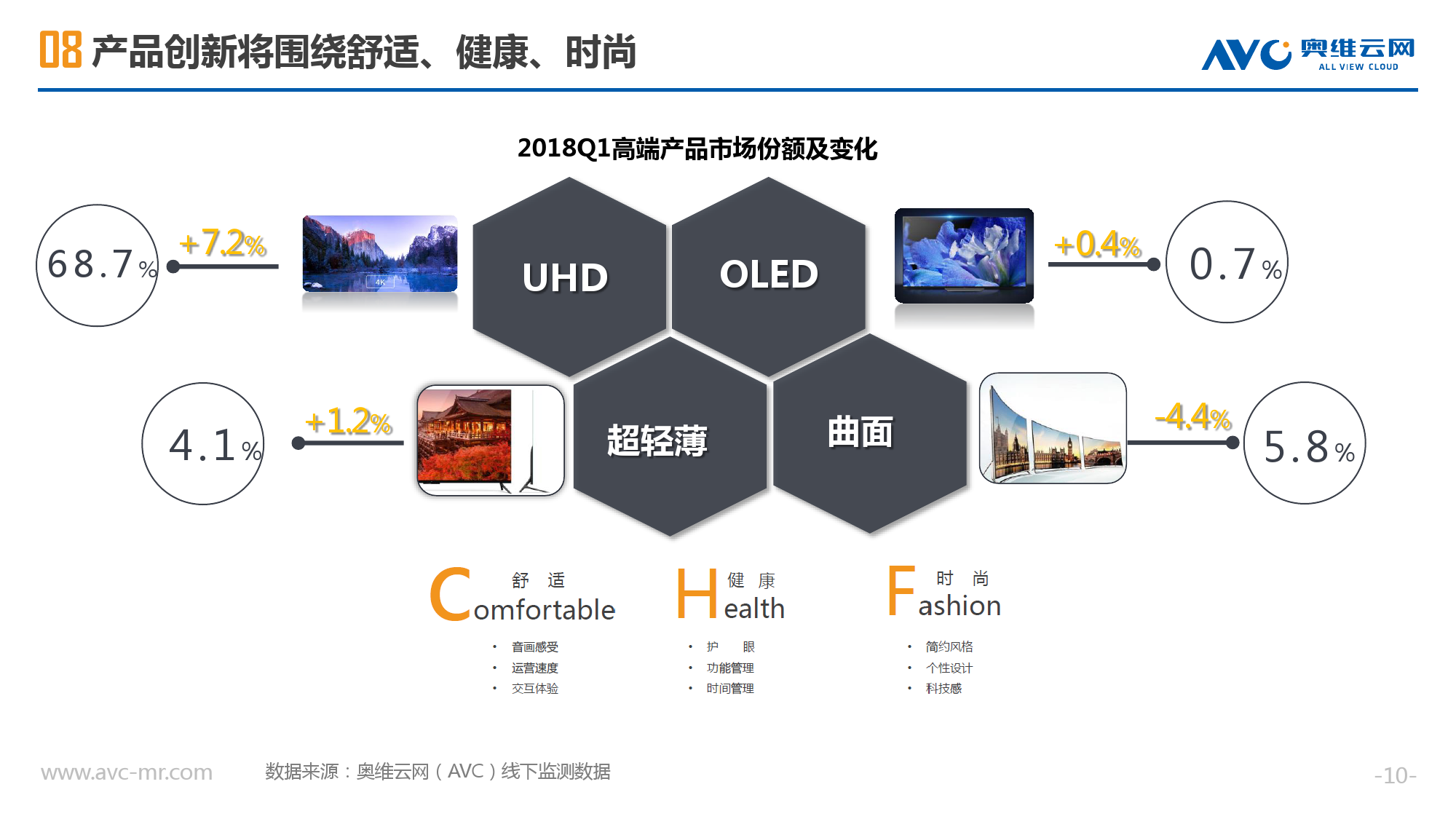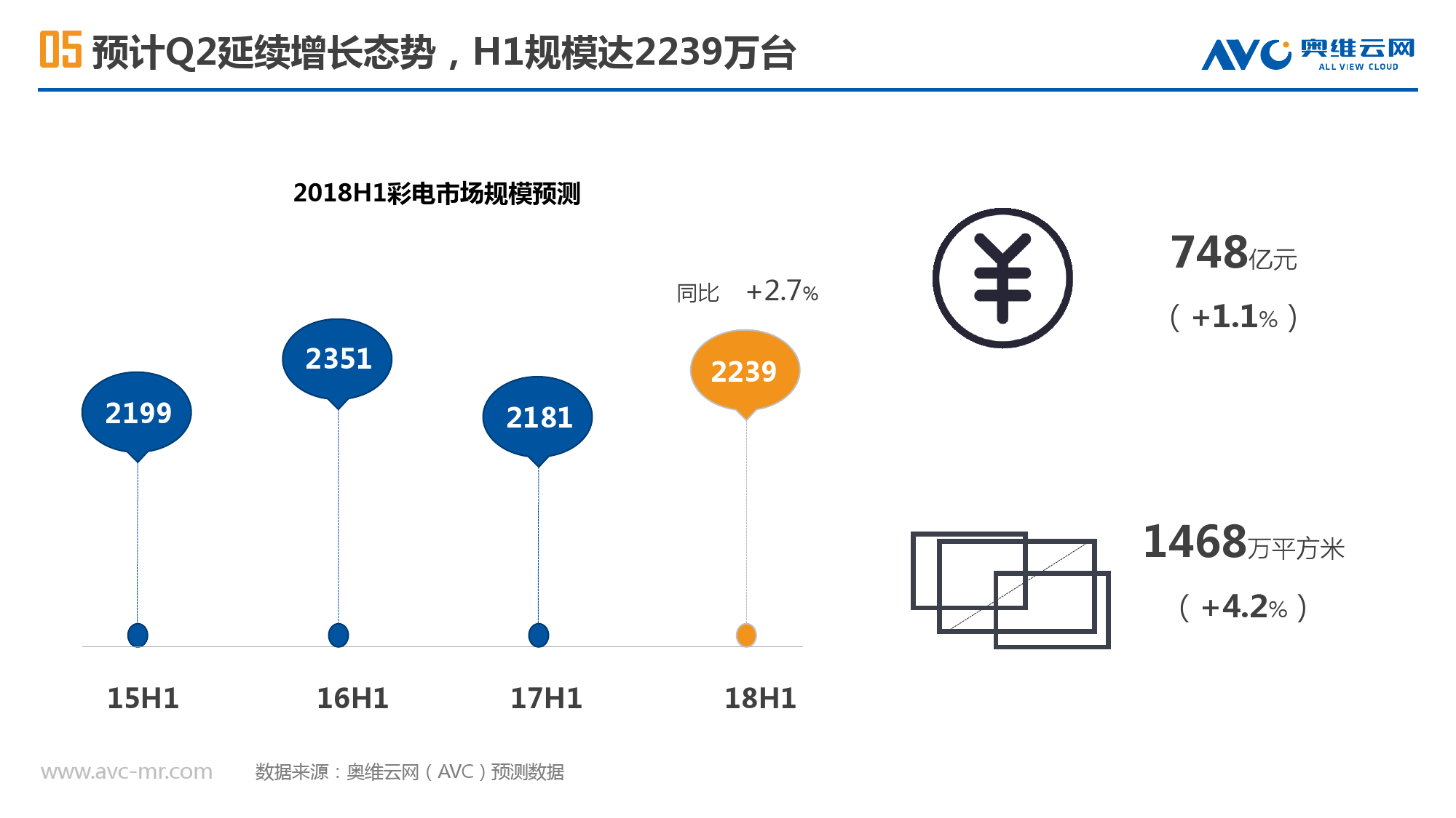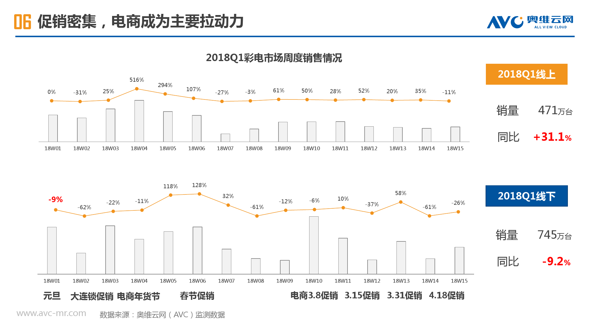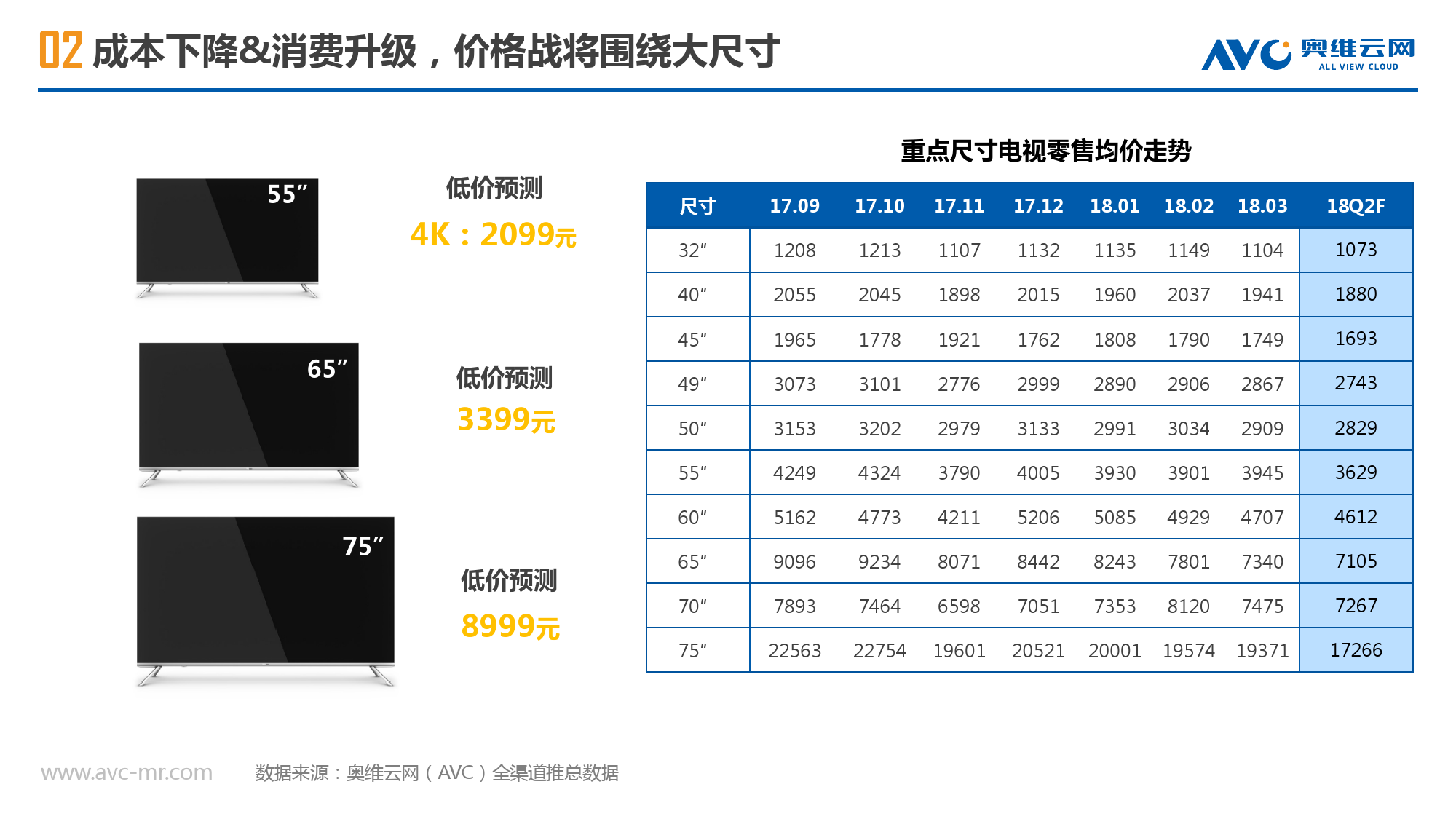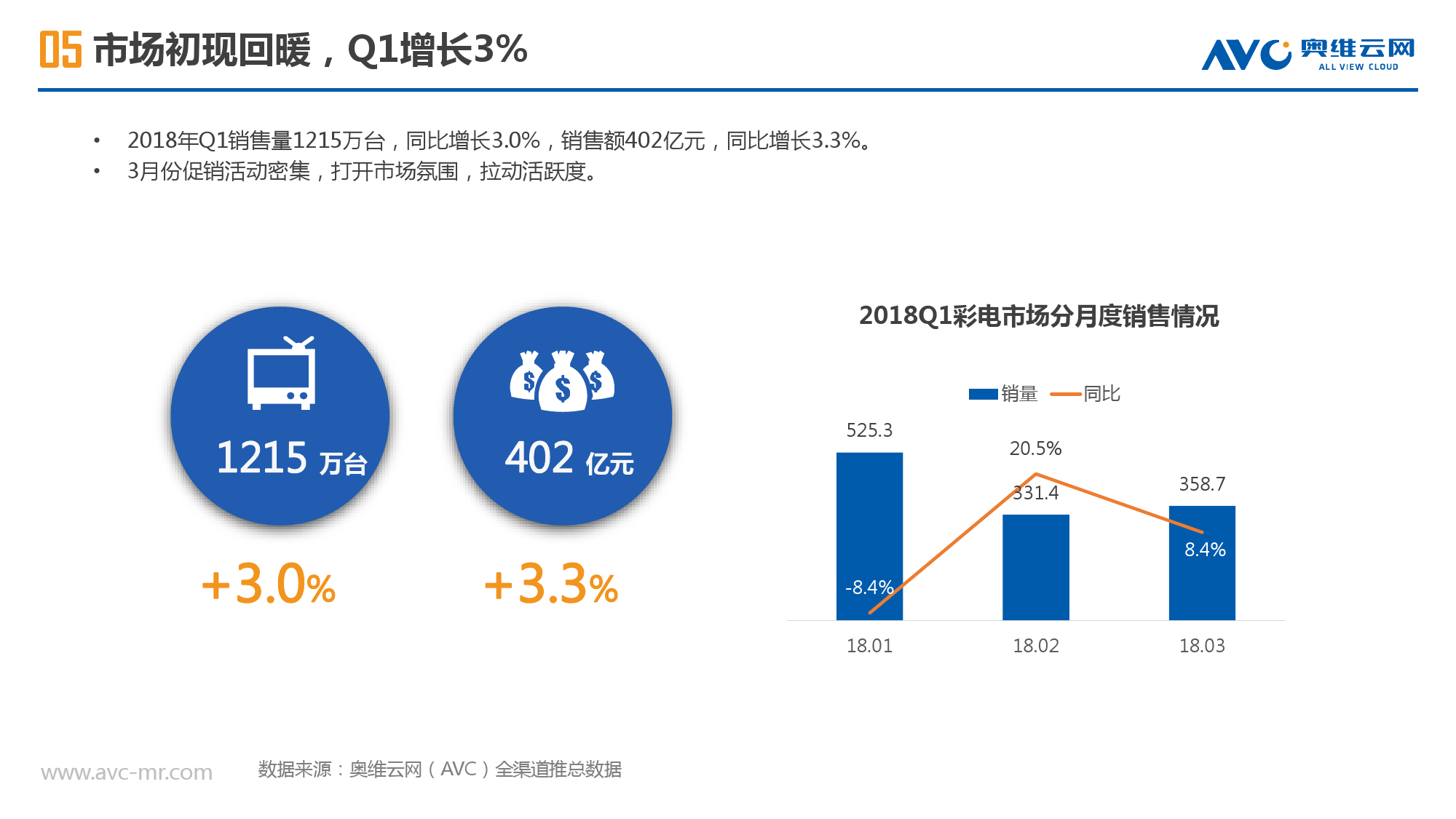 奥维云网(AVC)分析认为,2018年第一季度彩电市场表现特点有: