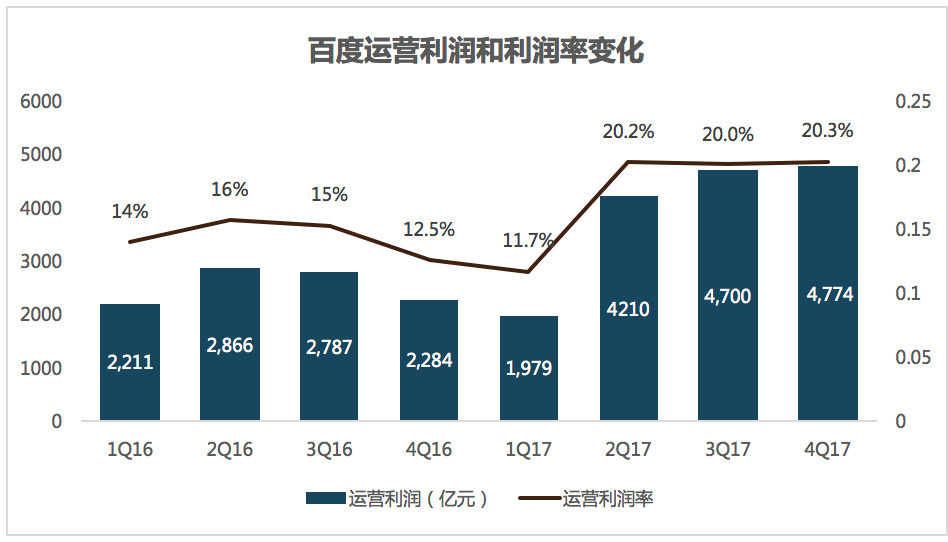 运营利润为46亿元,同比增长128%,Non GAAP运营利润为53亿元,同比增长103%,百度核心业务的运营利润为56亿元,同比增长9%,运营利润率为35%,持续好转。