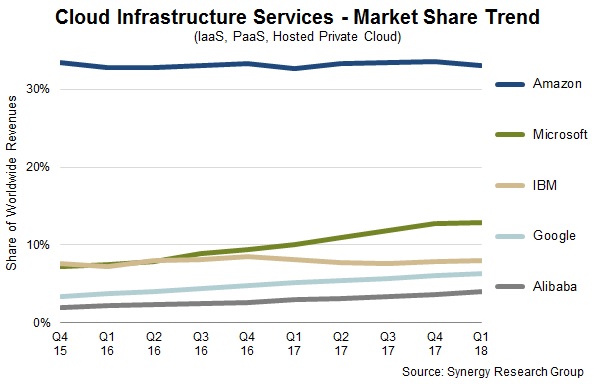 根据Synergy Research的最新数据,2018年第一季度云基础设施服务支出去年同期增长51%,轻松超过了前五个季度的增长率。市场领导者亚马逊增长的动力之一,因为其AWS部门自2016年年底以来就保持快速增长。过去12各季度AWS的市场份额稳定在33%左右,尽管市场规模几乎增长3倍。随着云计算服务持续繁荣,微软、谷歌和阿里巴巴等市场份额都有大幅增长,但这并没有影响AWS。相反,中小规模的云计算运营商的市场份额则有所下降。同时,IBM的市场份额一直稳定在8%左右,主要得益于其在托管私有云服务方面的强劲领导地位。