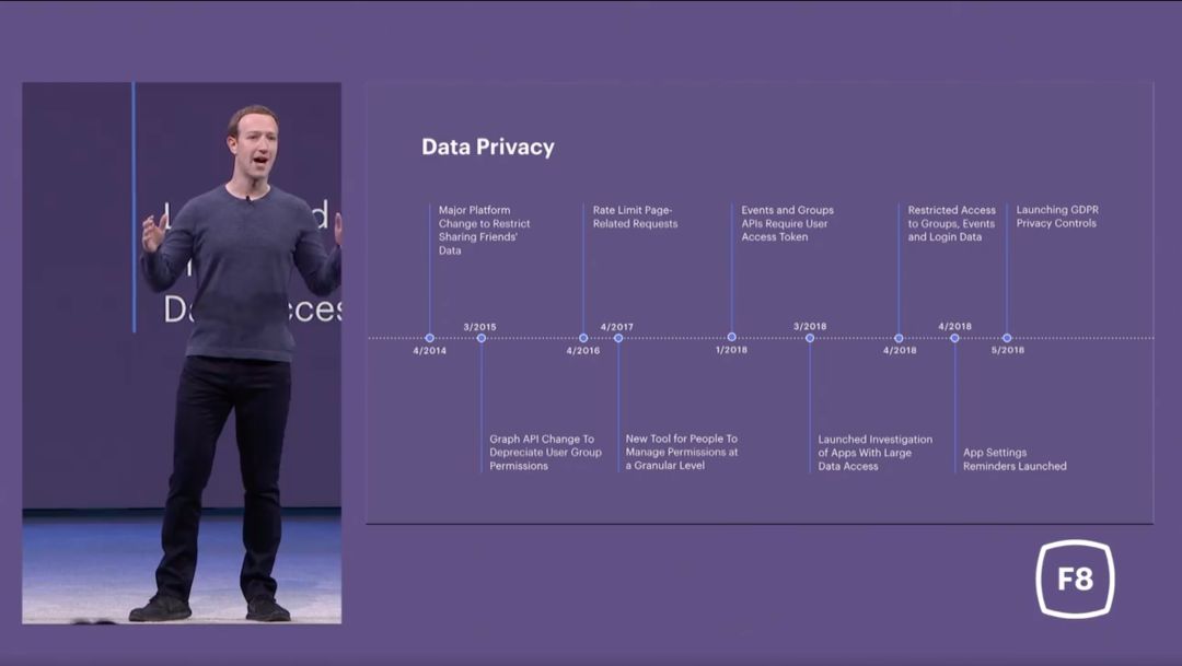 数据隐私保护方面,2014年4月就已经对分享好友数据做了限制,所以剑桥分析的事情从那个时候开始就不会再发生了。近期Facebook还在群组,事件,登陆数据方面做了访问限制;对第三方APP的获取的数据做了设置选项,同时已经开始遵循欧洲GDPR隐私保护法案。