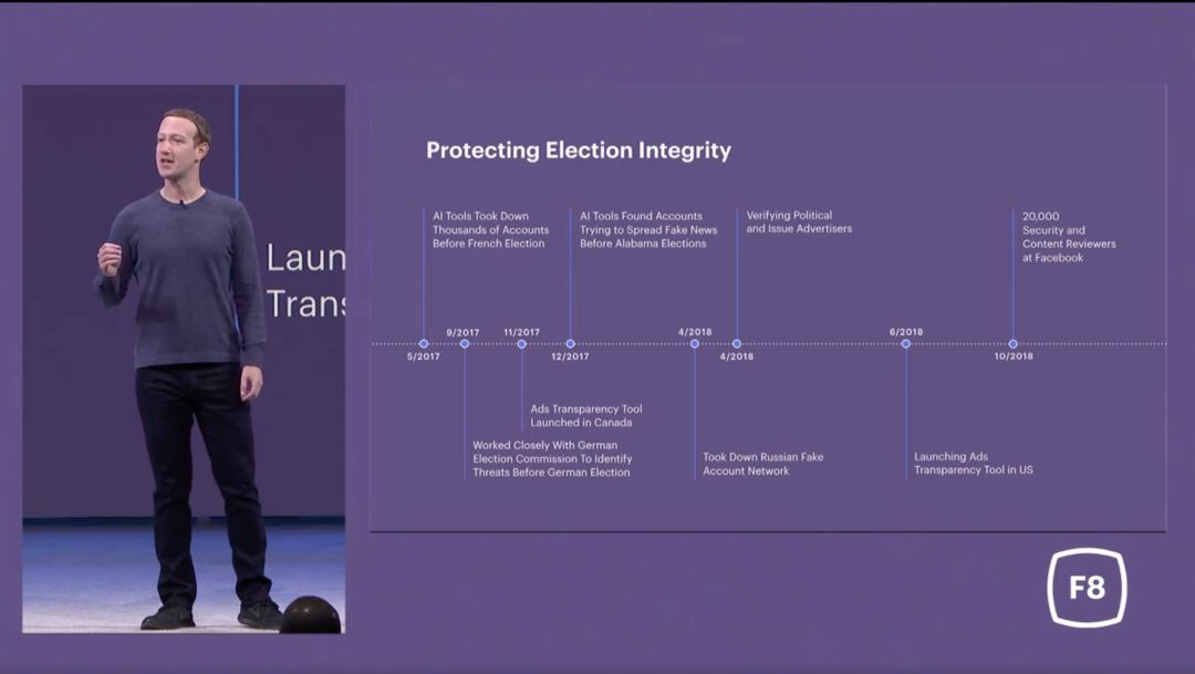 面对俄罗斯通过Facebook广告干扰美国选举的指责,Facebook将会提高选举广告的真实性和透明度。如跟各国各地区的选举部门合作识别选举威胁,在选举前通过工具识别打击账号,在美国推出政治广告透明度举措,并拥有2万多人的内容审核人员队伍。
