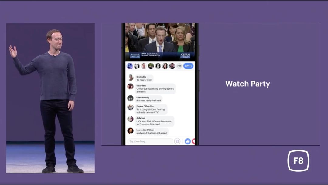 为了让人们更好地与亲人互动,共同参与。Facebook推出的Watch Party功能以让你邀请你的好友一起看视频,分享喜怒哀乐。演讲中小扎自嘲且不失幽默地分享了自己在国会作证时,好友们围观的场景。