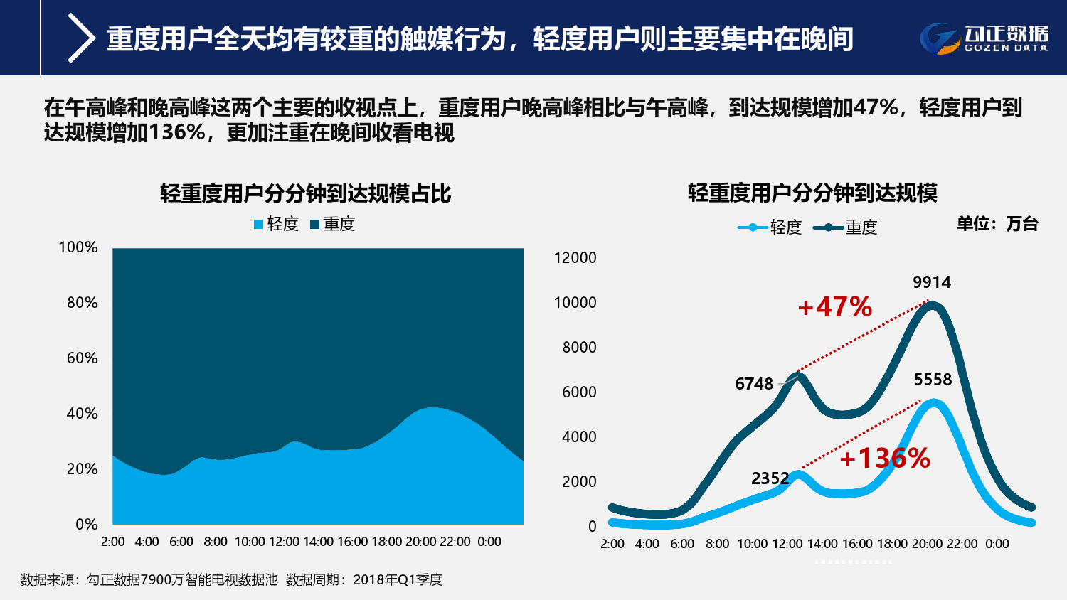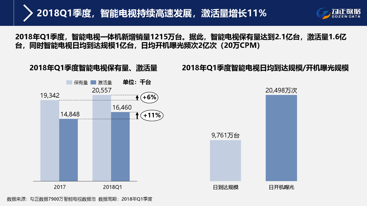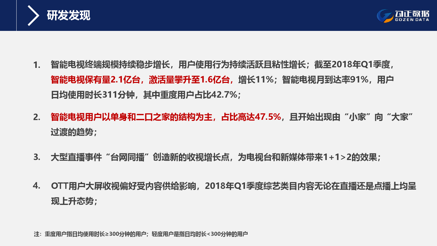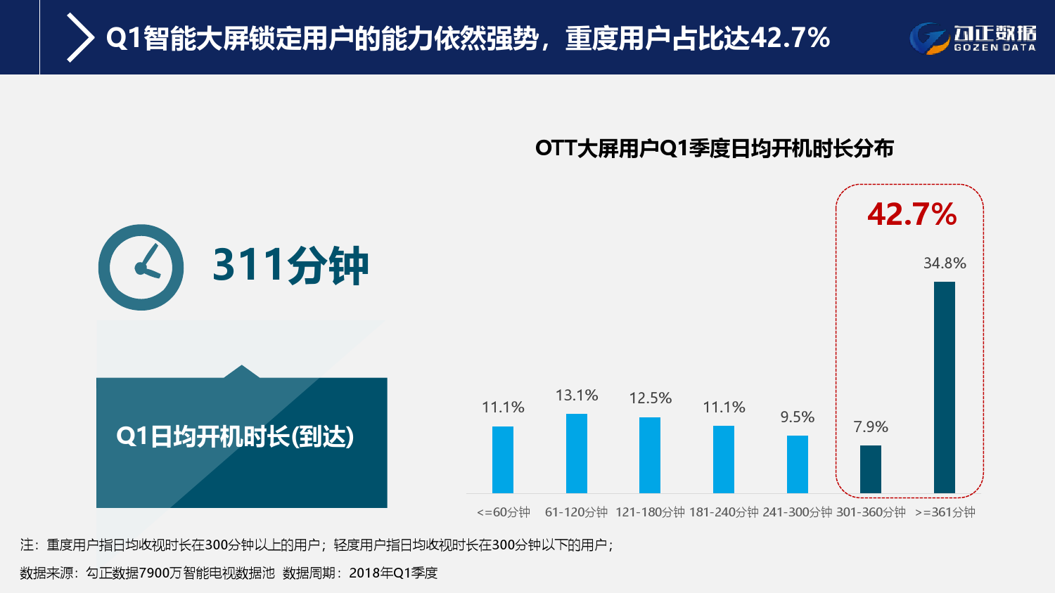 1、智能电视终端规模持续稳步增长,用户使用行为持续活跃且粘性增长;截至2018年Q1季度,智能电视保有量2.1亿台,激活量攀升至1.6亿台,增长11%;智能电视月到达率91%,用户日均使用时长311分钟,其中重度用户占比42.7%;