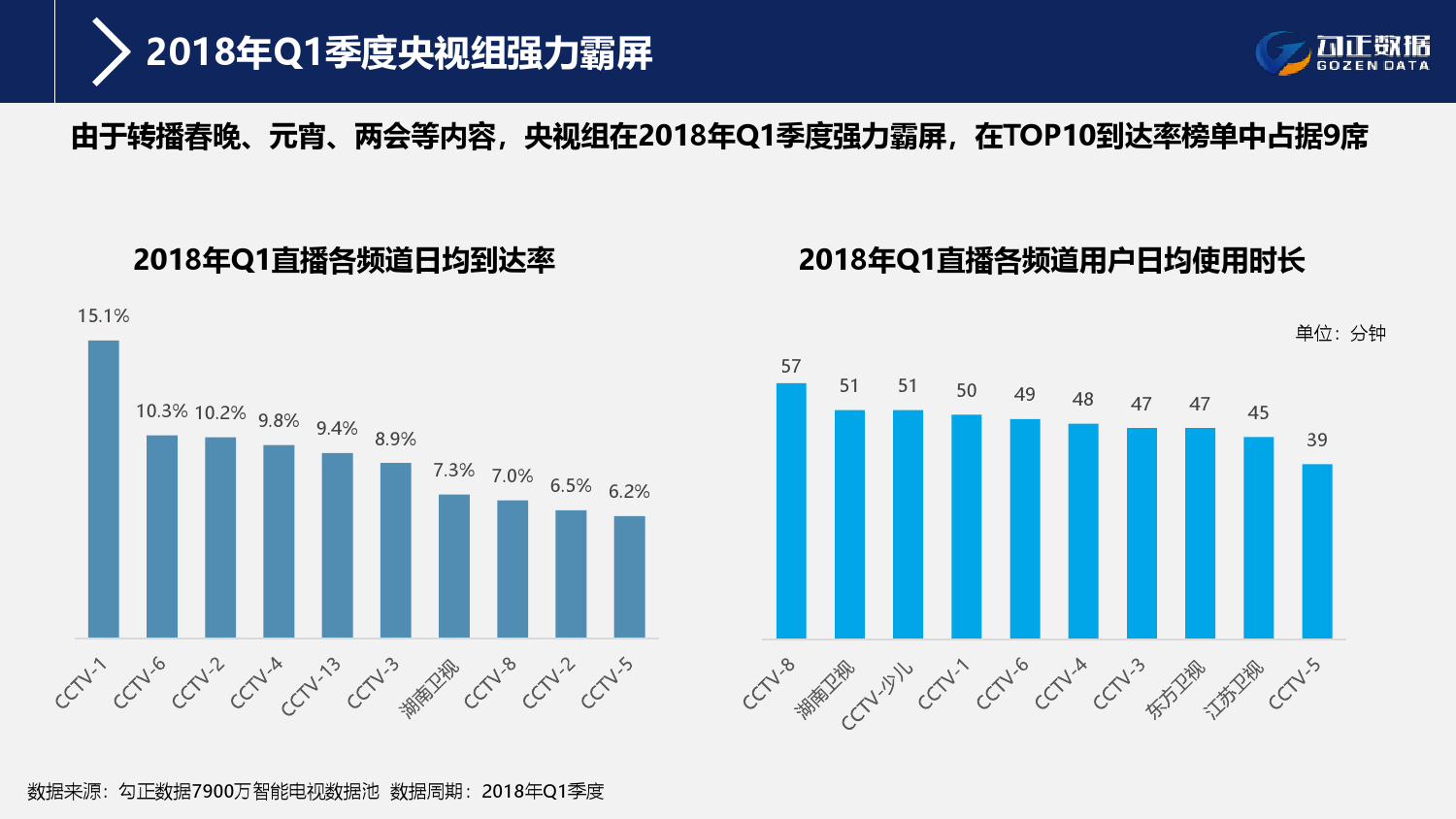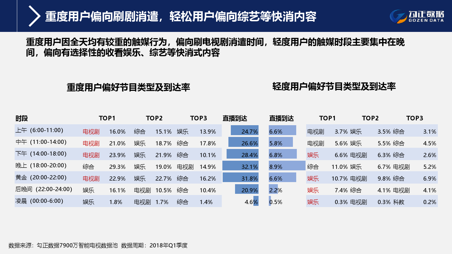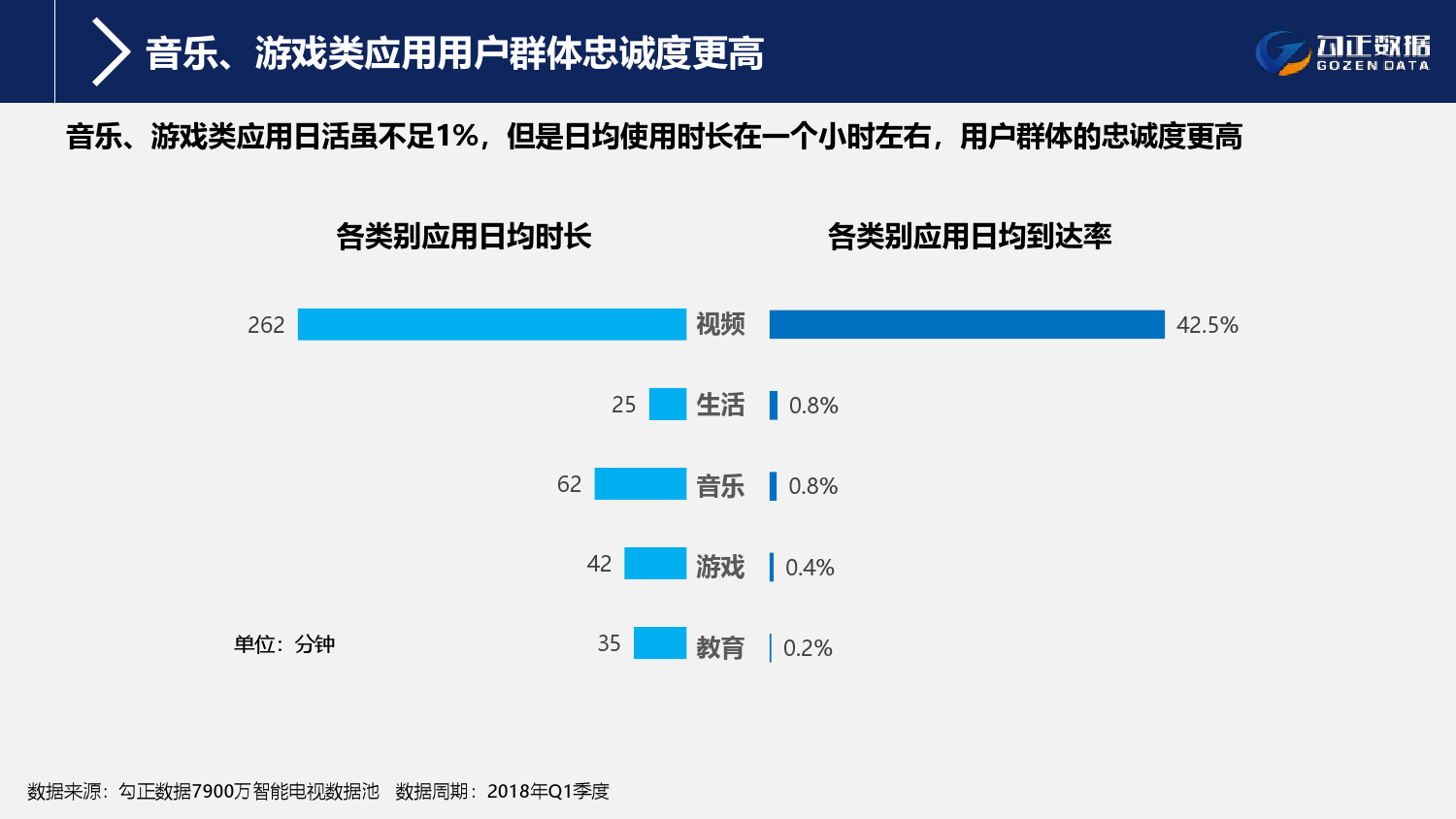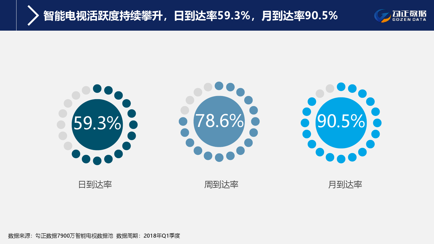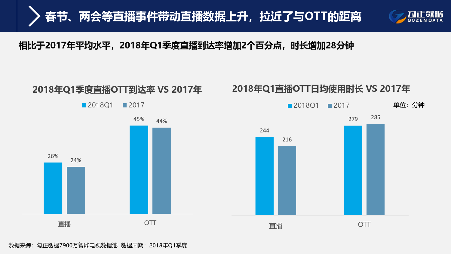 1、智能电视终端规模持续稳步增长,用户使用行为持续活跃且粘性增长;截至2018年Q1季度,智能电视保有量2.1亿台,激活量攀升至1.6亿台,增长11%;智能电视月到达率91%,用户日均使用时长311分钟,其中重度用户占比42.7%;