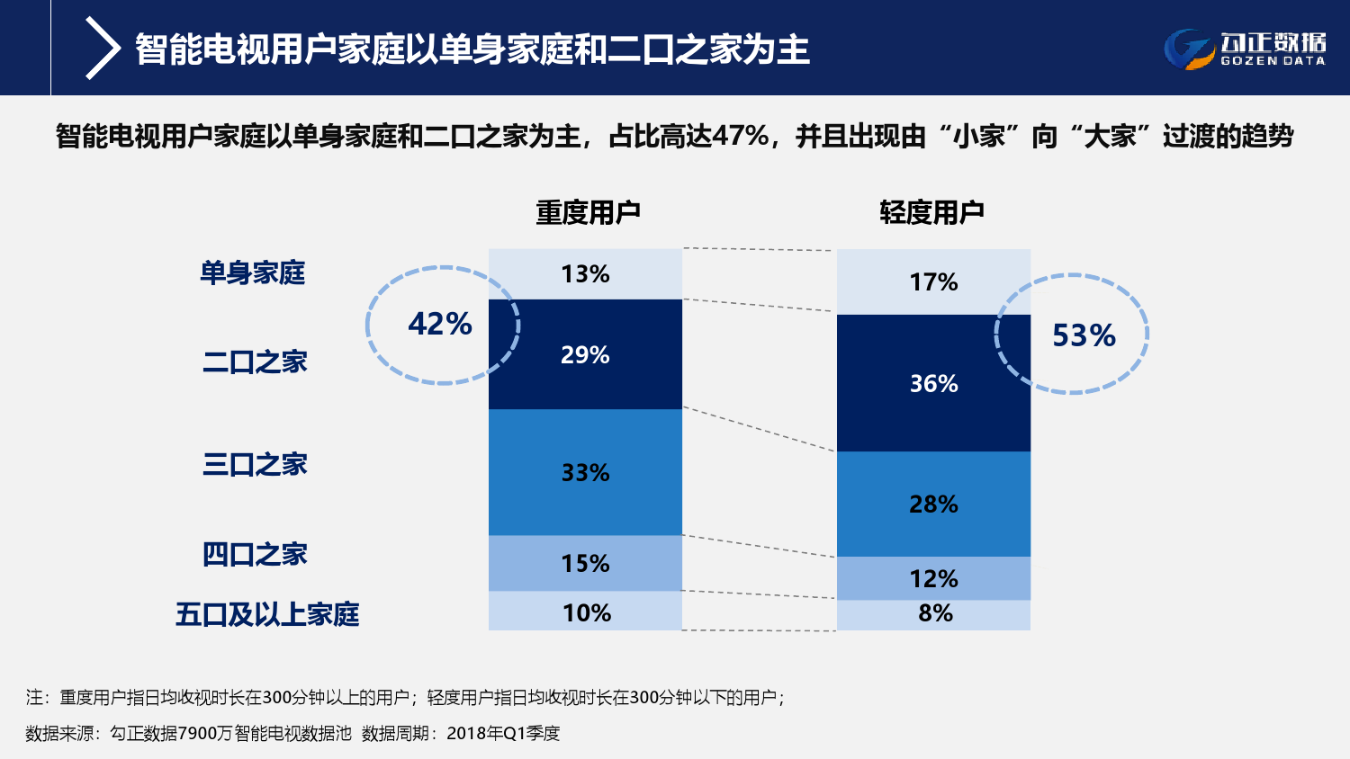 2、智能电视用户以单身和二口之家的结构为主,占比高达47.5%,且开始出现由“小家”向“大家”过渡的趋势;