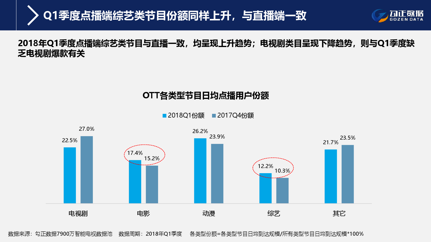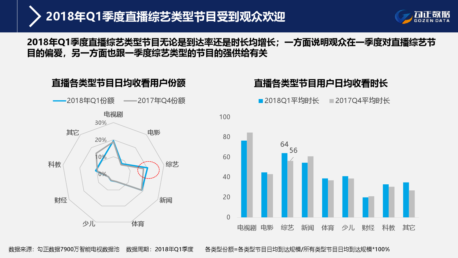 4、OTT用户大屏收视偏好受内容供给影响,2018年Q1季度综艺类目内容无论在直播还是点播上均呈现上升态势;