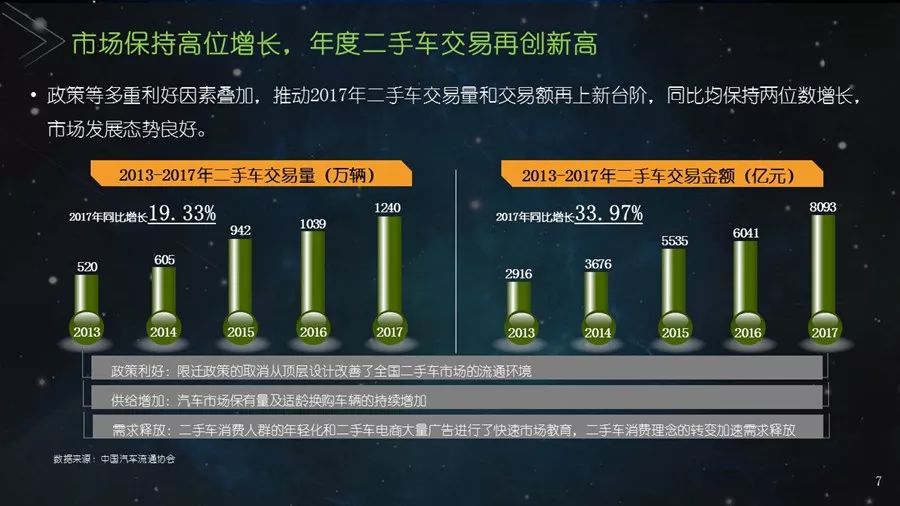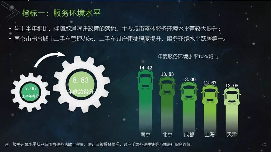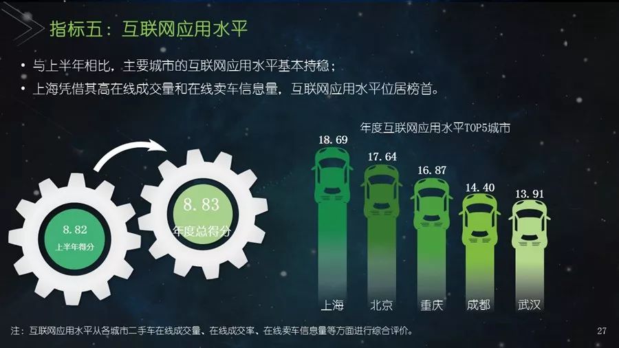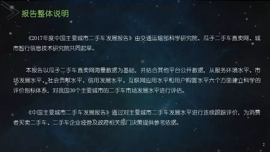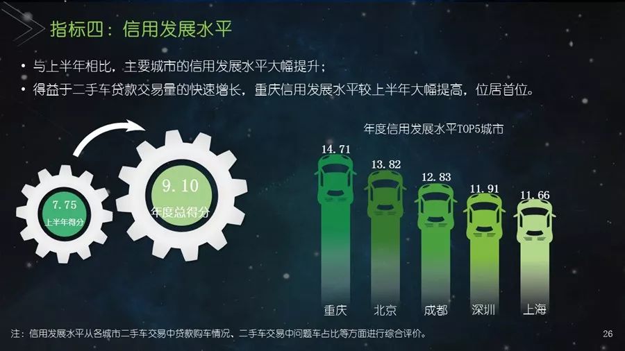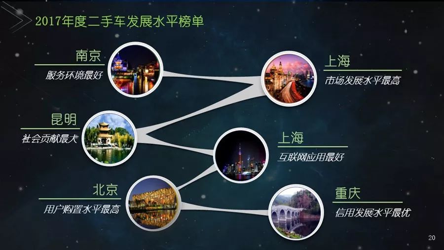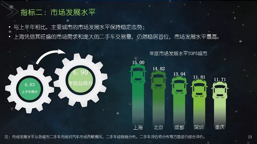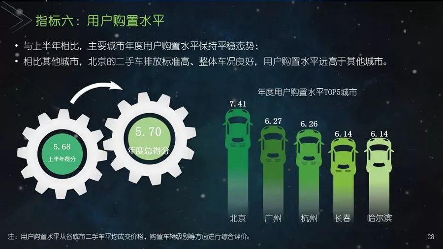《二手车发展报告》以瓜子二手车直卖网海量数据为基础,并结合其他平台公开数据,从服务环境水平、市场发展水平、社会贡献水平、信用发展水平、互联网应用水平和用户购置水平六个方面建立科学的评价指标体系,对我国30个主要城市的二手车市场发展水平进行评估;为消费者买卖二手车、二手车企业经营及政府相关部门决策提供参考依据。结果显示:2017年,二手车市场同比增长19.33%,其中,跨区域成交量同比增幅109.9%;90后人群以26.2%的消费占比成为二手车消费新势力,同时带动金融信贷消费;上海二手车市场发展水平最高并且互联网应用最好,南京市场服务环境最好,北京用户购置水平最高,昆明社会贡献最大,重庆信用发展水平最优。