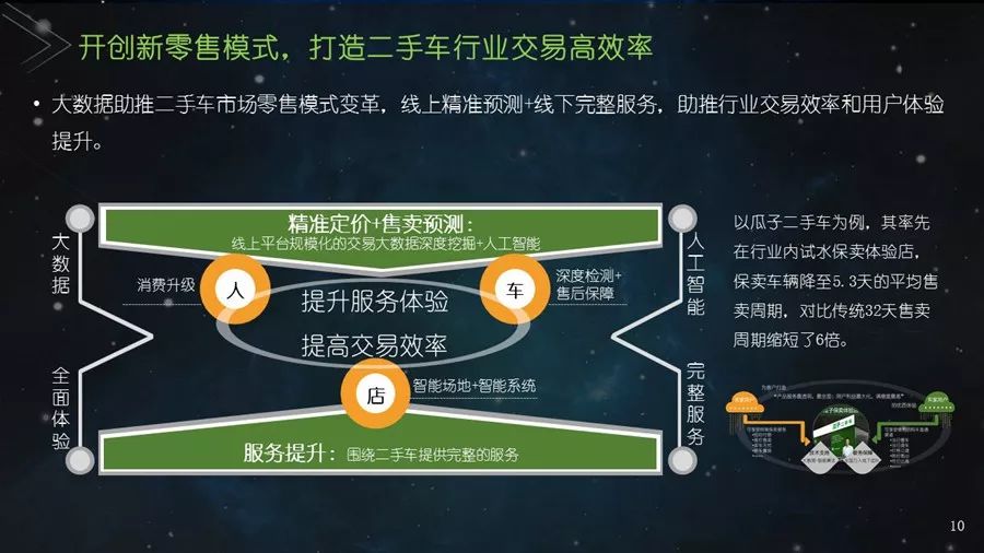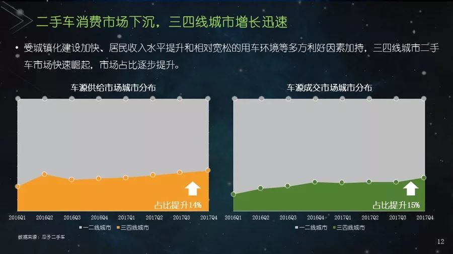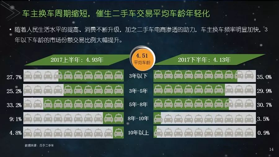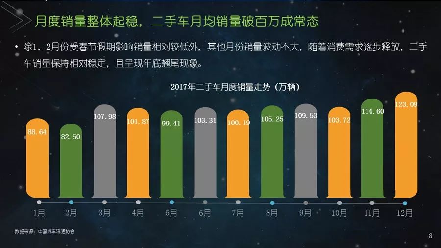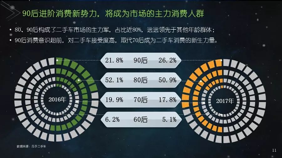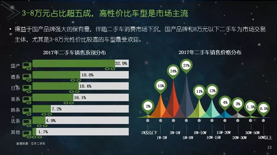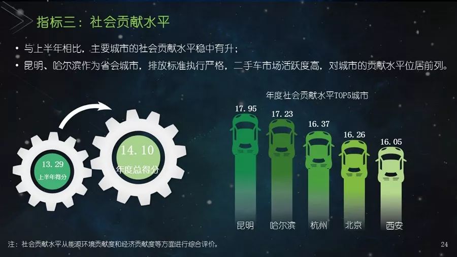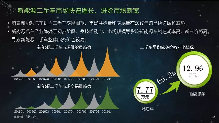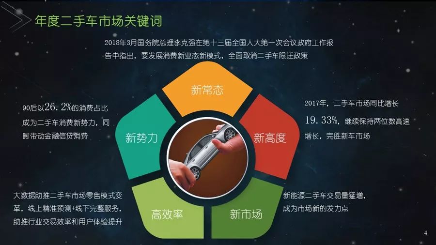 《二手车发展报告》以瓜子二手车直卖网海量数据为基础,并结合其他平台公开数据,从服务环境水平、市场发展水平、社会贡献水平、信用发展水平、互联网应用水平和用户购置水平六个方面建立科学的评价指标体系,对我国30个主要城市的二手车市场发展水平进行评估;为消费者买卖二手车、二手车企业经营及政府相关部门决策提供参考依据。结果显示:2017年,二手车市场同比增长19.33%,其中,跨区域成交量同比增幅109.9%;90后人群以26.2%的消费占比成为二手车消费新势力,同时带动金融信贷消费;上海二手车市场发展水平最高并且互联网应用最好,南京市场服务环境最好,北京用户购置水平最高,昆明社会贡献最大,重庆信用发展水平最优。