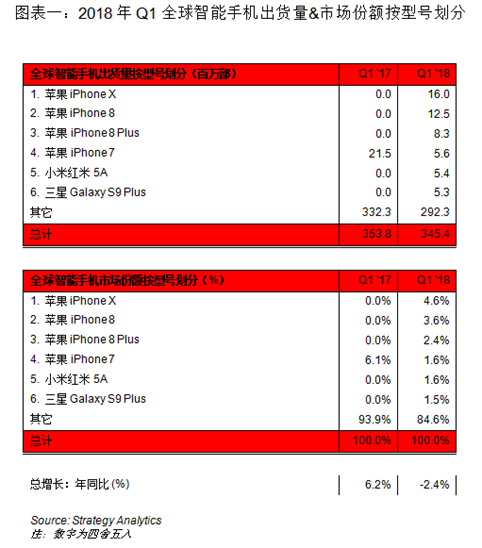 Strategy Analytics发布的最新研究报告指出,2018年Q1全球智能手机出货量达到3.45亿部。尽管定价昂贵,但苹果iPhone X仍是全球最畅销的智能手机型号,该季度出货量达到惊人的1600万部。 小米红米 5A和三星Galaxy S9 Plus成为全球畅销的安卓智能手机型号。