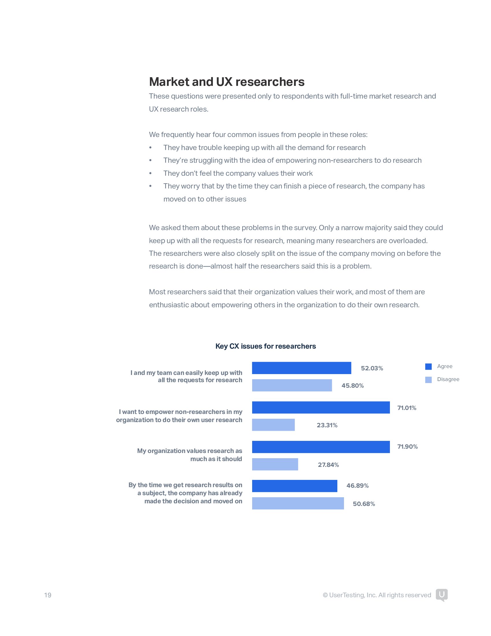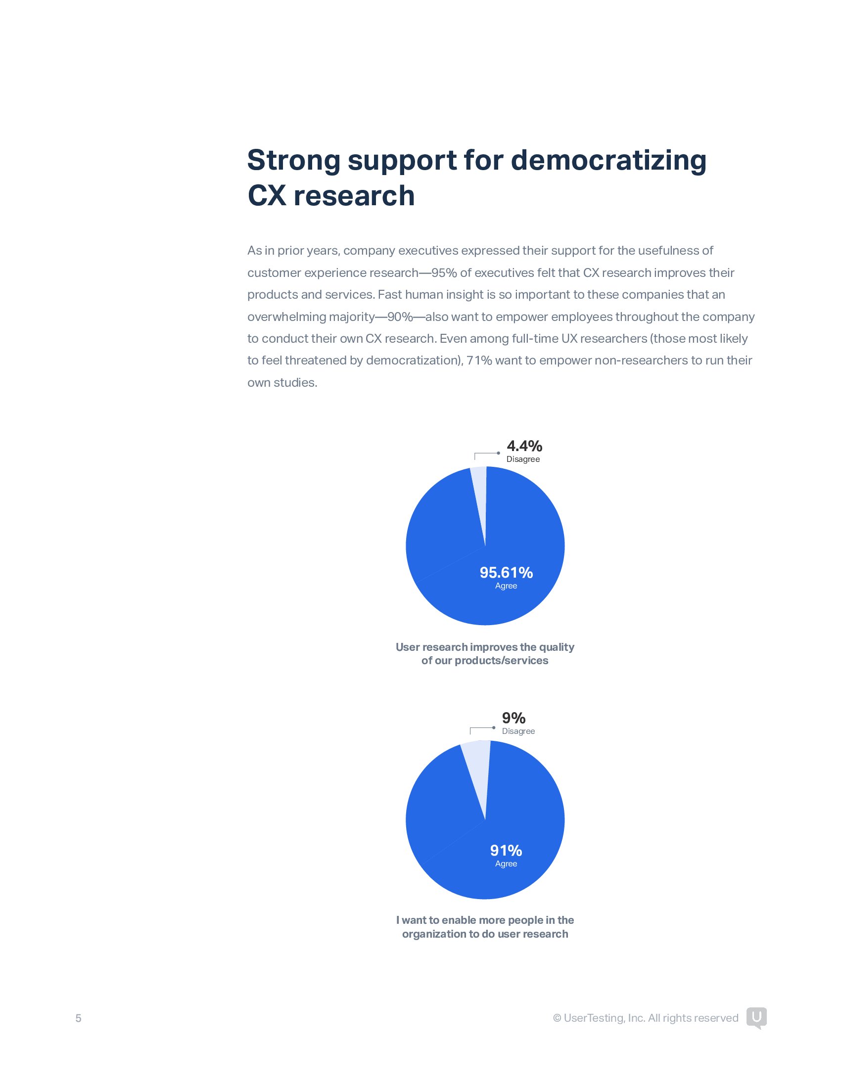和往年一样,高管支持客户体验研究的实用性研究,95%的高管认为CX研究改进了他们的产品和服务。快速的洞察力对企业非常重要,绝大多数受访者(90%)希望授权整个公司的员工开展自己的CX研究。即使在全职用户体验研究人员中,71%希望赋予非研究人员自己研究的能力。