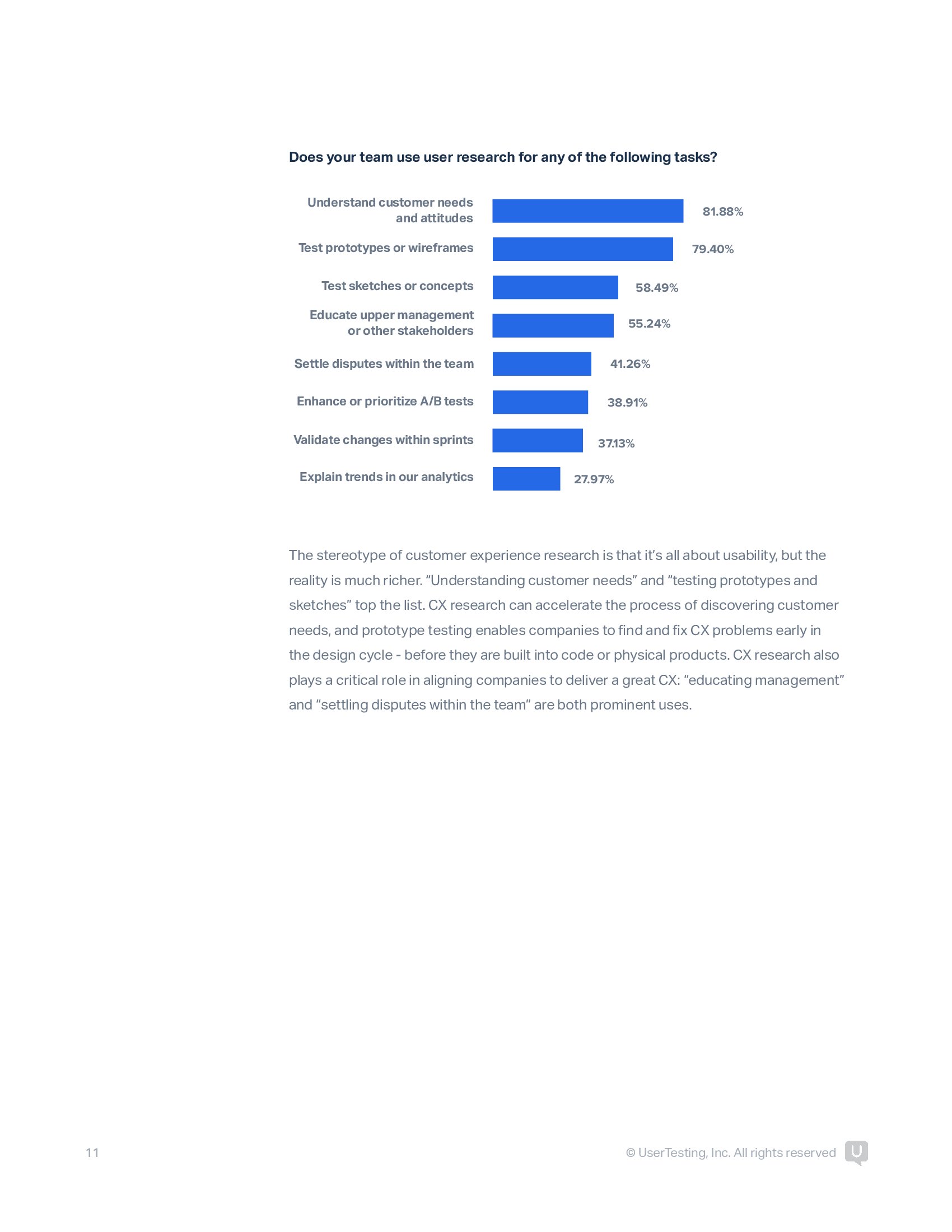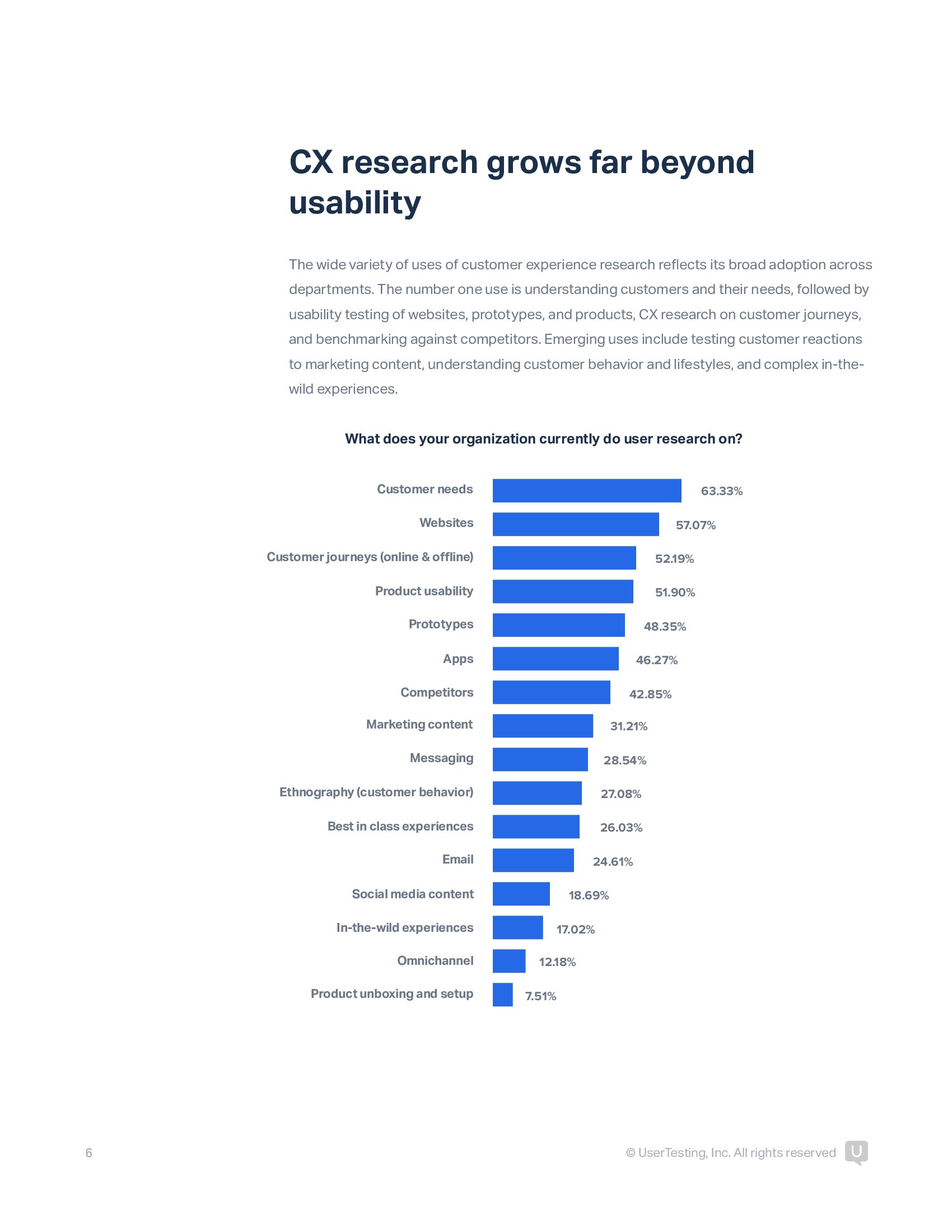 客户体验研究在各部门得到广泛应用。首要用途是了解客户及其需求,其次是网站、原型和产品的可用性测试,以及与竞争对手的基准测试。新兴用途包括测试客户对营销内容的反应,了解客户行为和生活方式等。