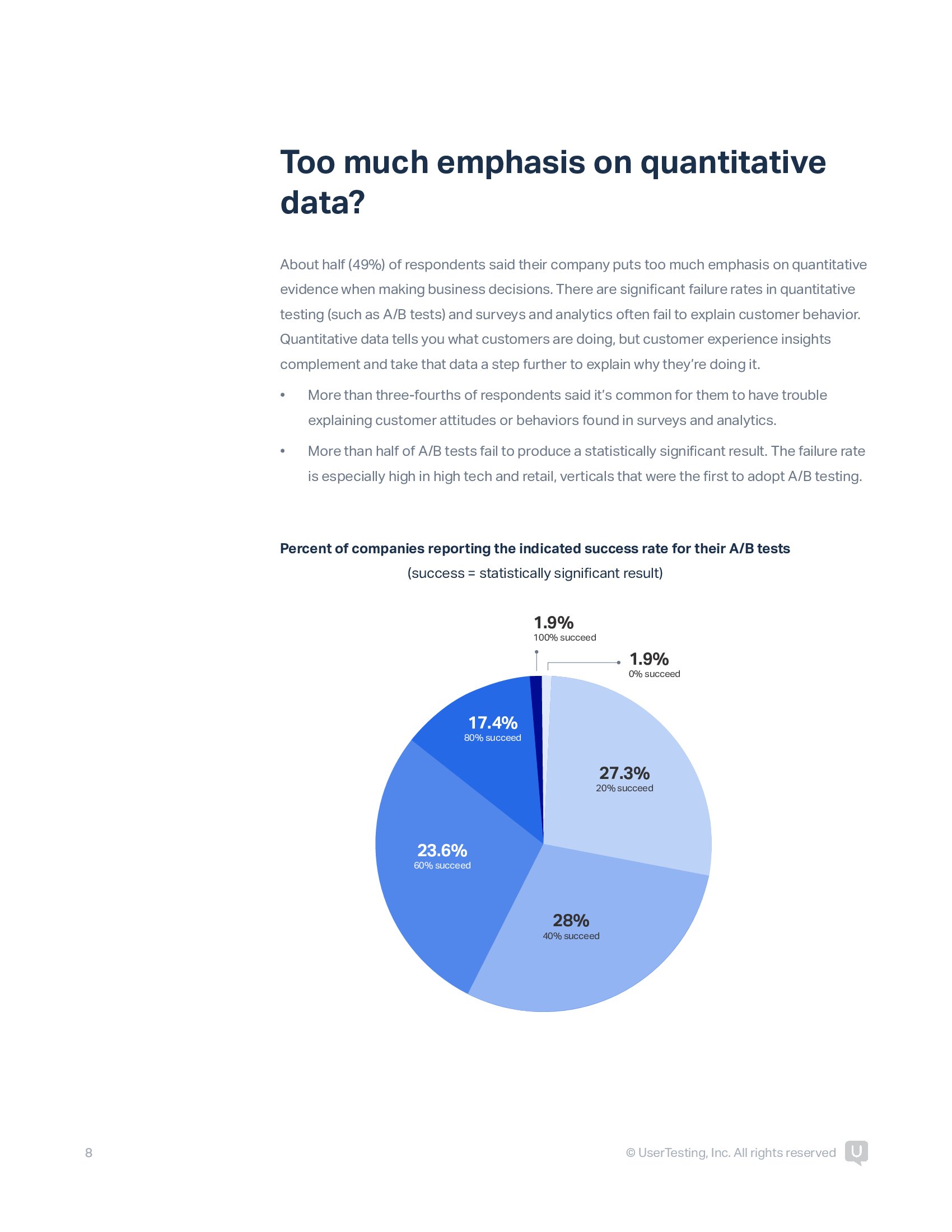 约一半(49%)的受访者表示,企业在做出商业决策时过分强调量化证据。定量测试(如A / B测试)失败几率非常高,调查和分析常常无法解释客户行为。定量数据告诉你客户正在做什么,但客户体验洞察补充并将这些数据进一步解释为什么他们这样做。超过3/4的受访者表示,无法解释调查和分析中的客户态度或行为是很常见的。超过一半的A / B测试未能产生统计显著结果。高科技和零售业的失败率尤其高,这是最常用A / B测试的垂直行业。