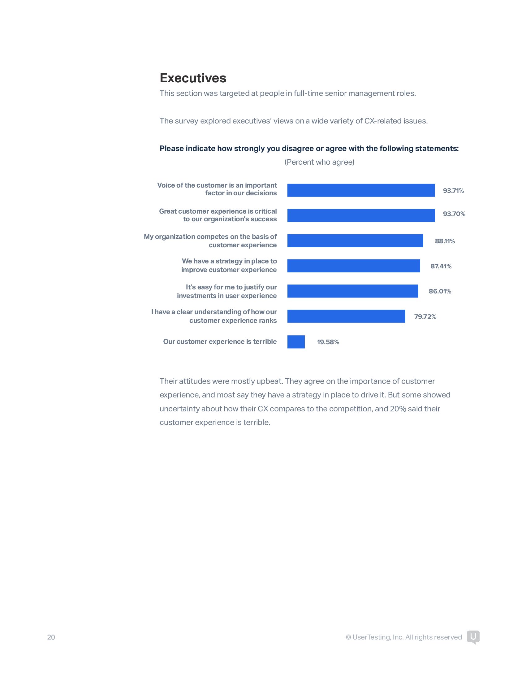 95%的高管表示,优秀的客户体验对成功至关重要。高管可能对他们的客户体验质量过于自信。高管和CX经理比其他职位的人更有可能报告他们的企业拥有非常好的CX。高管可能不太了解他们的客户体验的缺陷。