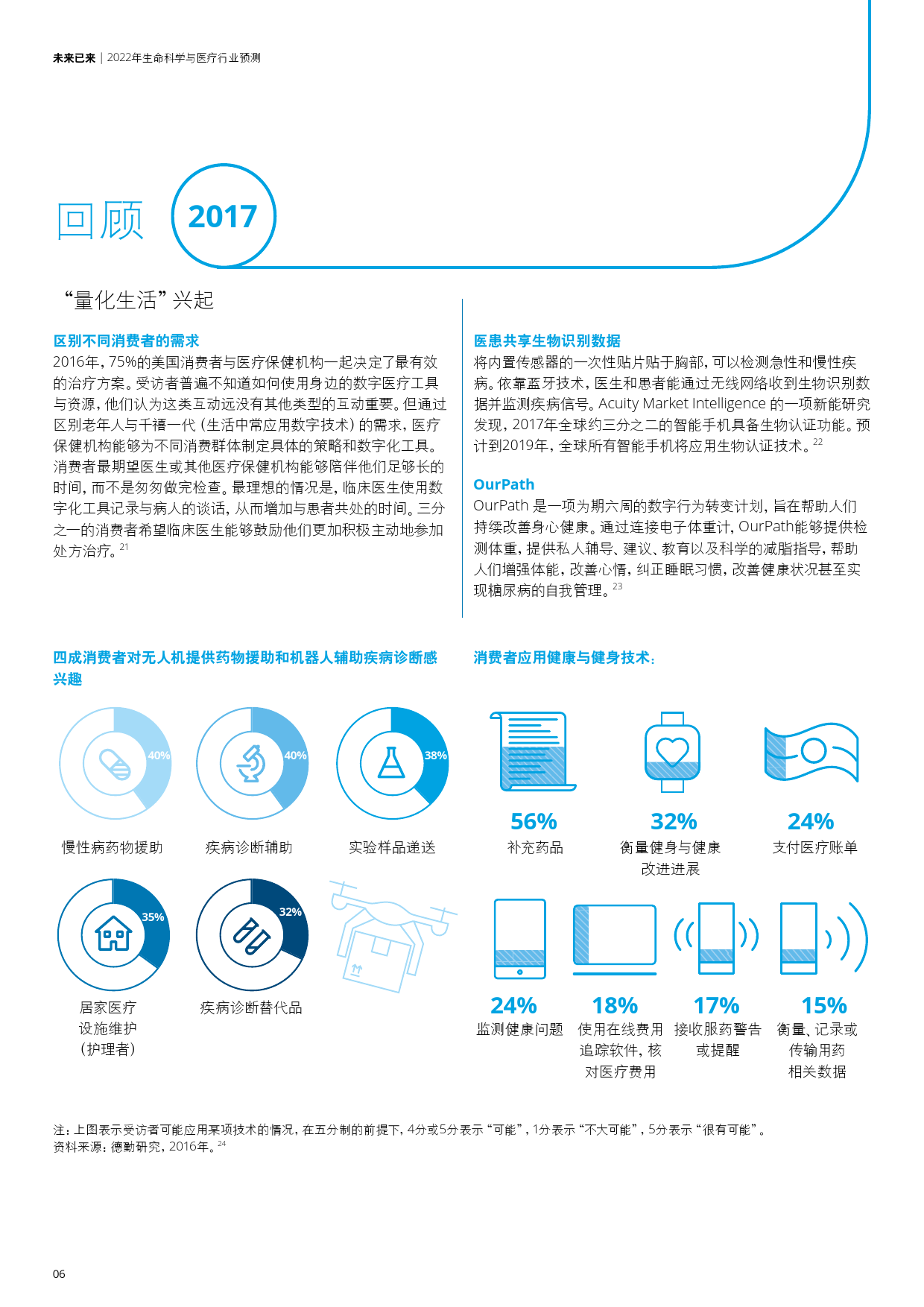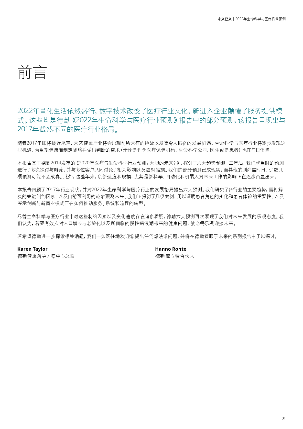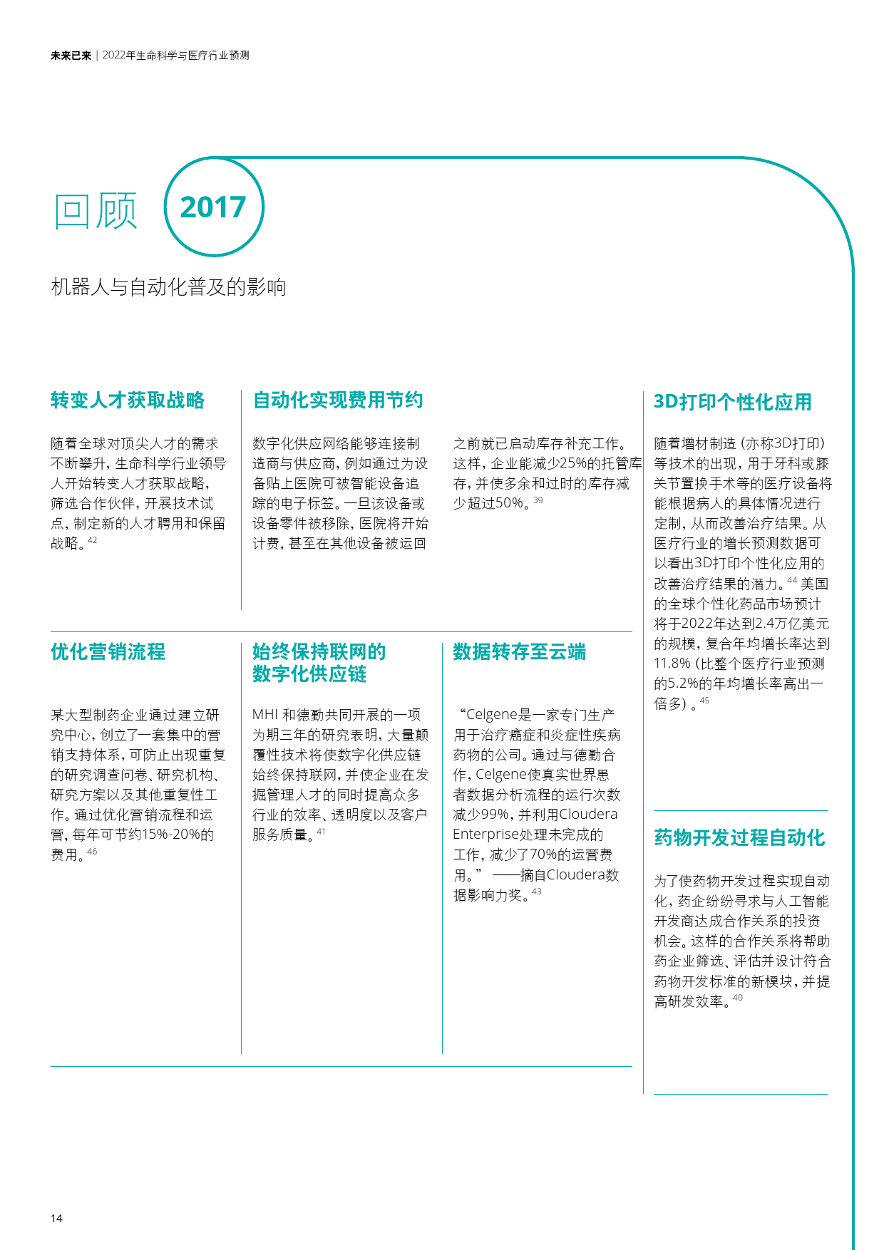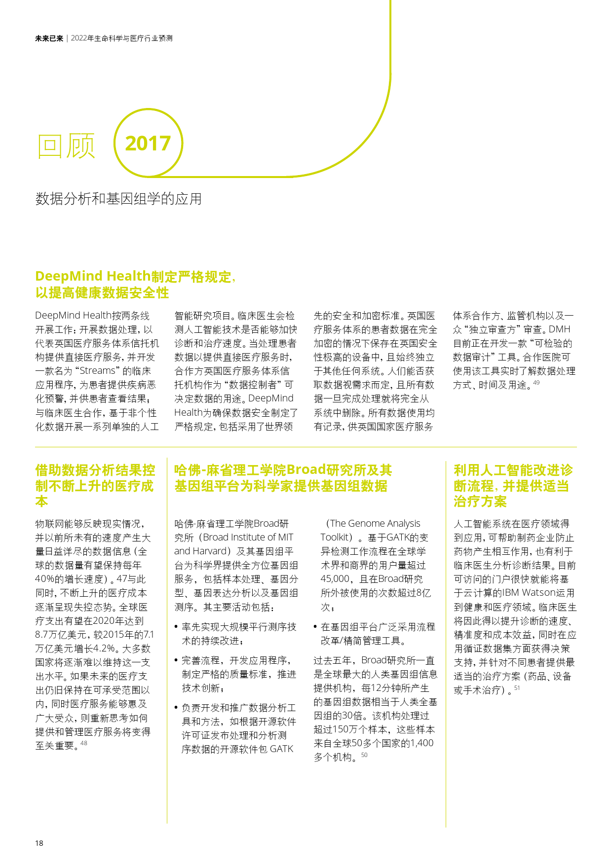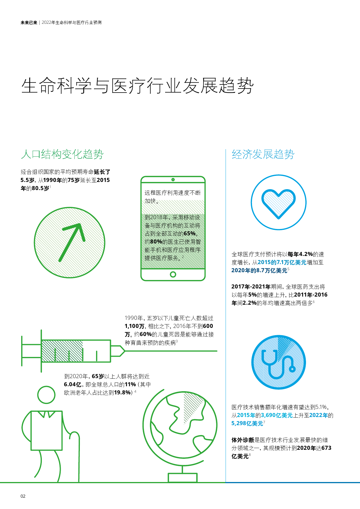 这份报告展现了我们对未来发展的乐观态度,呼吁企业意识到未来已来,回顾了2017年行业现状,并对2022年生命科学与医疗行业的发展格局提出六大预测,以及讨论了需要克服的关键阻碍: