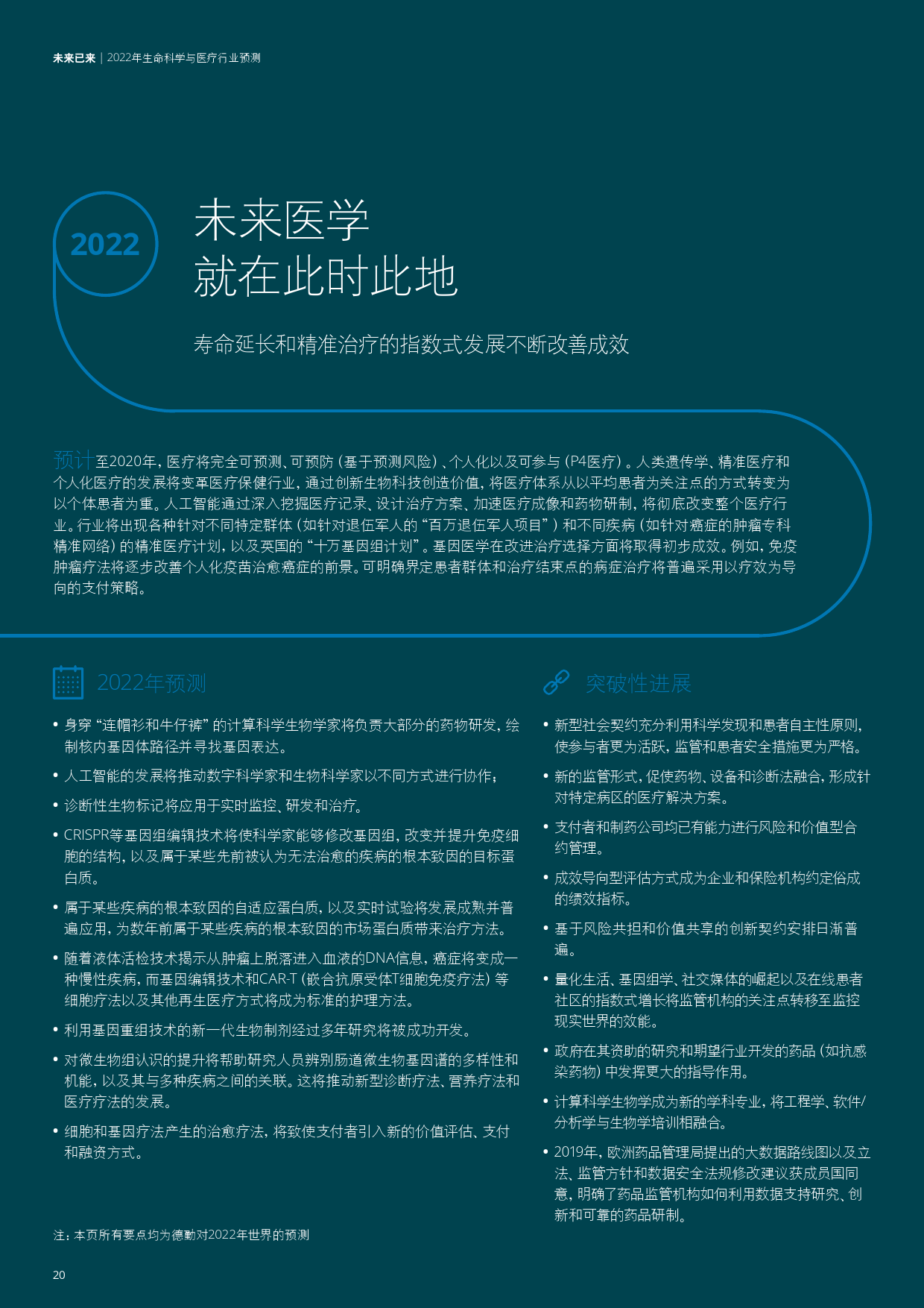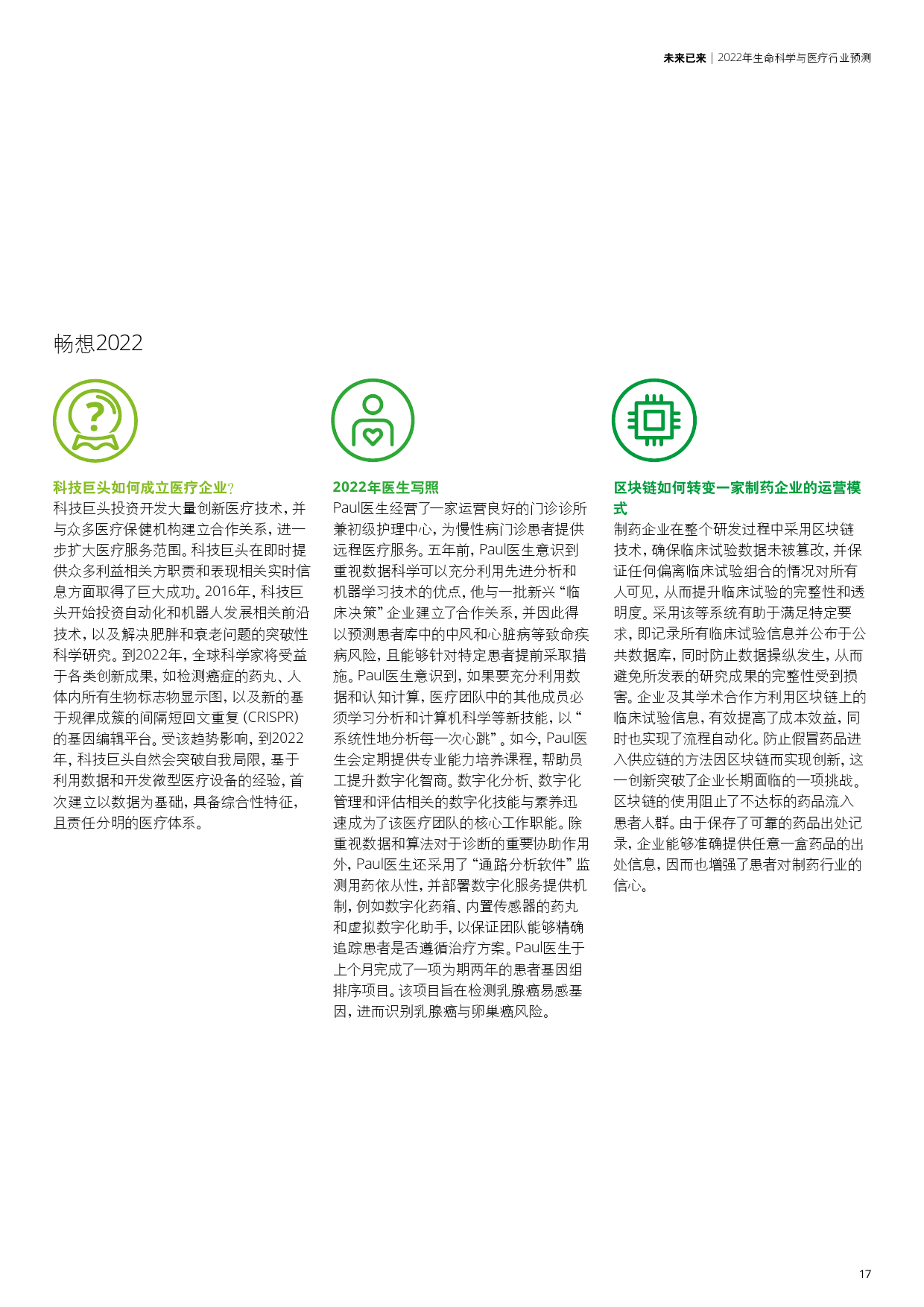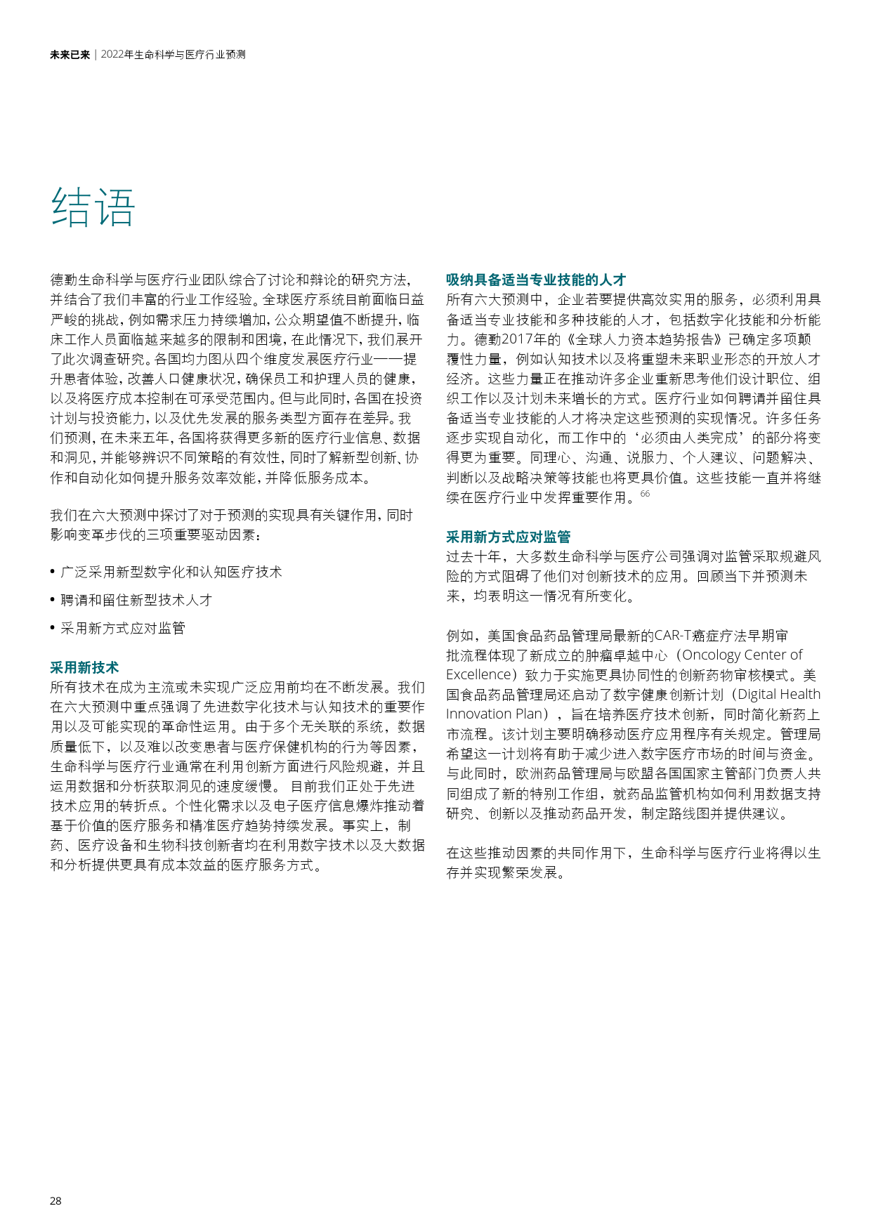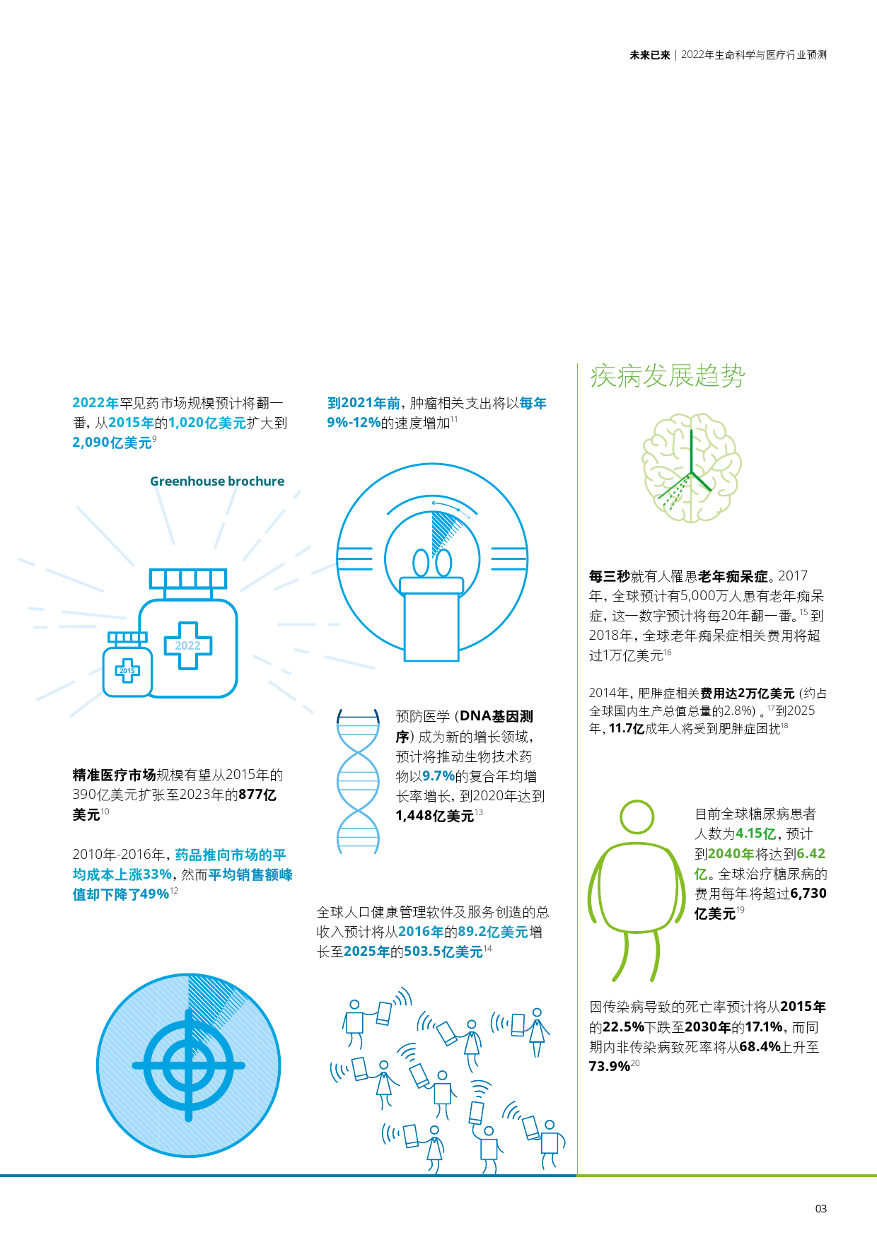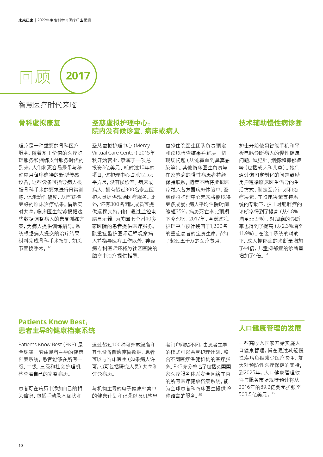 这份报告展现了我们对未来发展的乐观态度,呼吁企业意识到未来已来,回顾了2017年行业现状,并对2022年生命科学与医疗行业的发展格局提出六大预测,以及讨论了需要克服的关键阻碍: