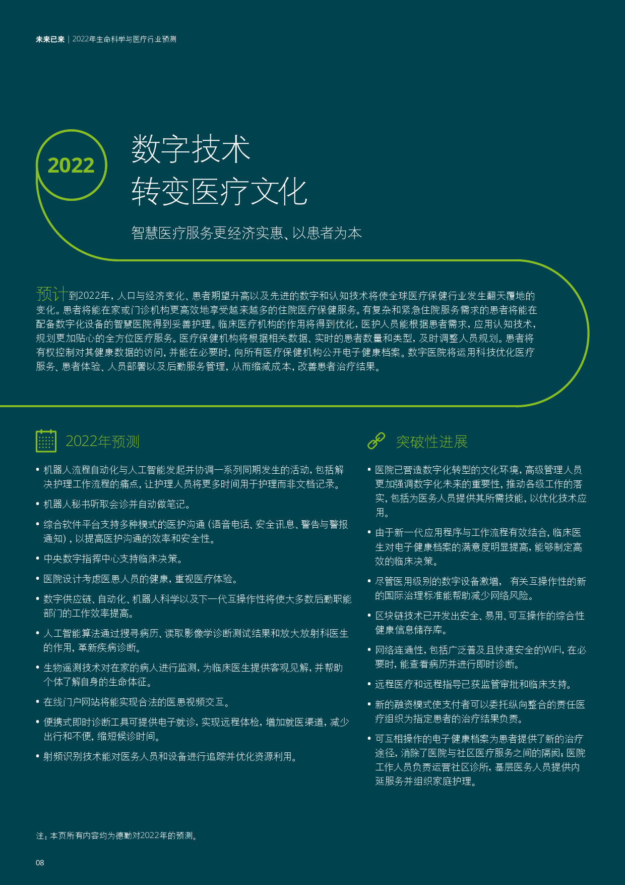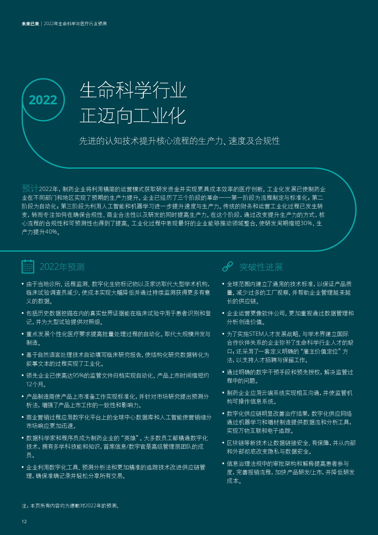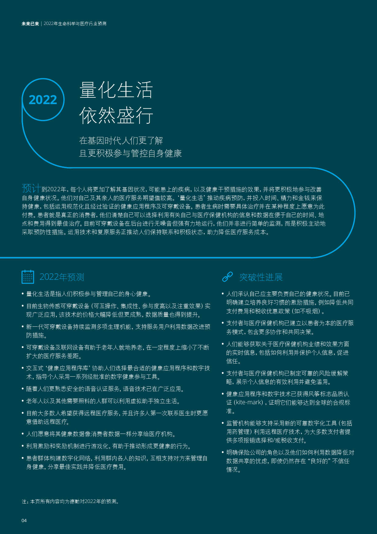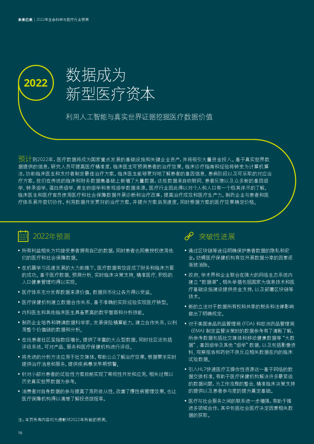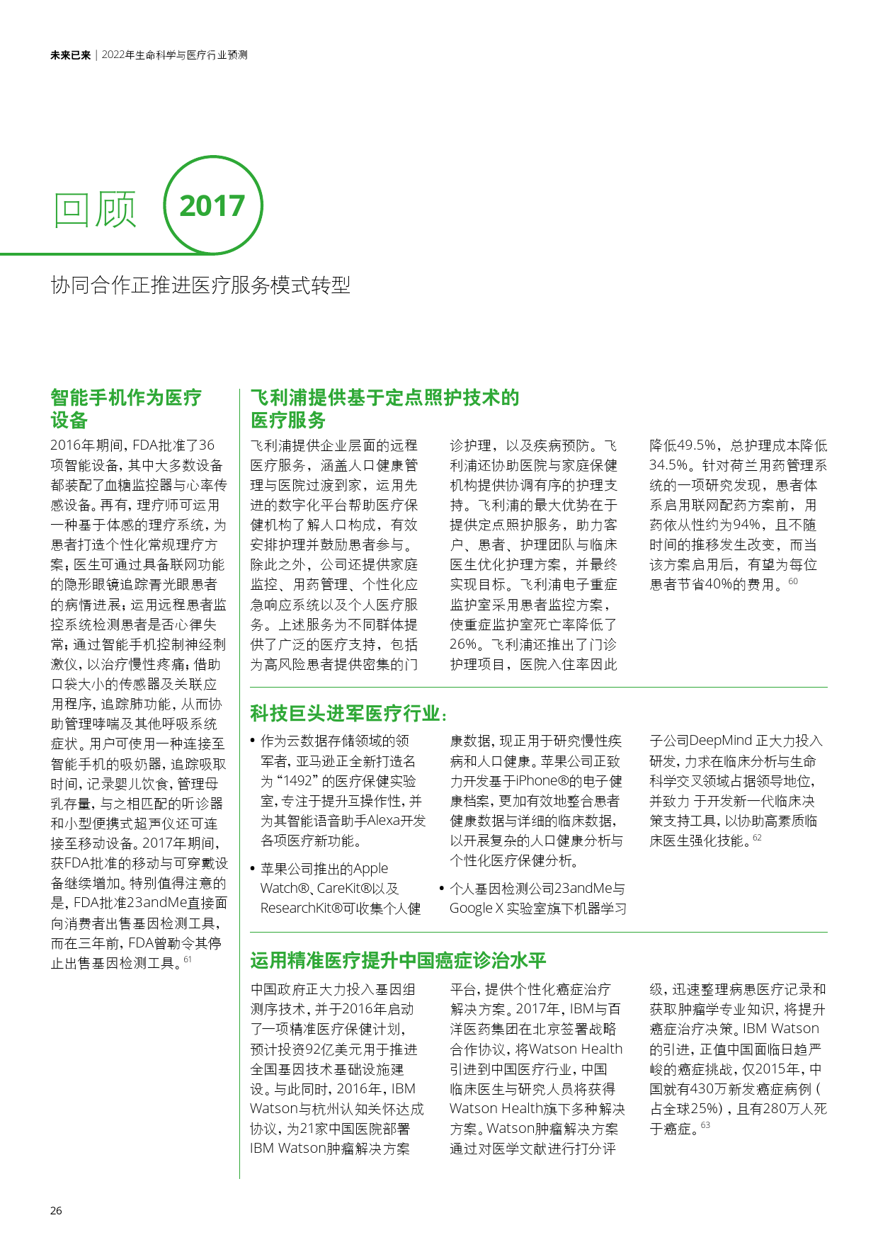 这份报告展现了我们对未来发展的乐观态度,呼吁企业意识到未来已来,回顾了2017年行业现状,并对2022年生命科学与医疗行业的发展格局提出六大预测,以及讨论了需要克服的关键阻碍: