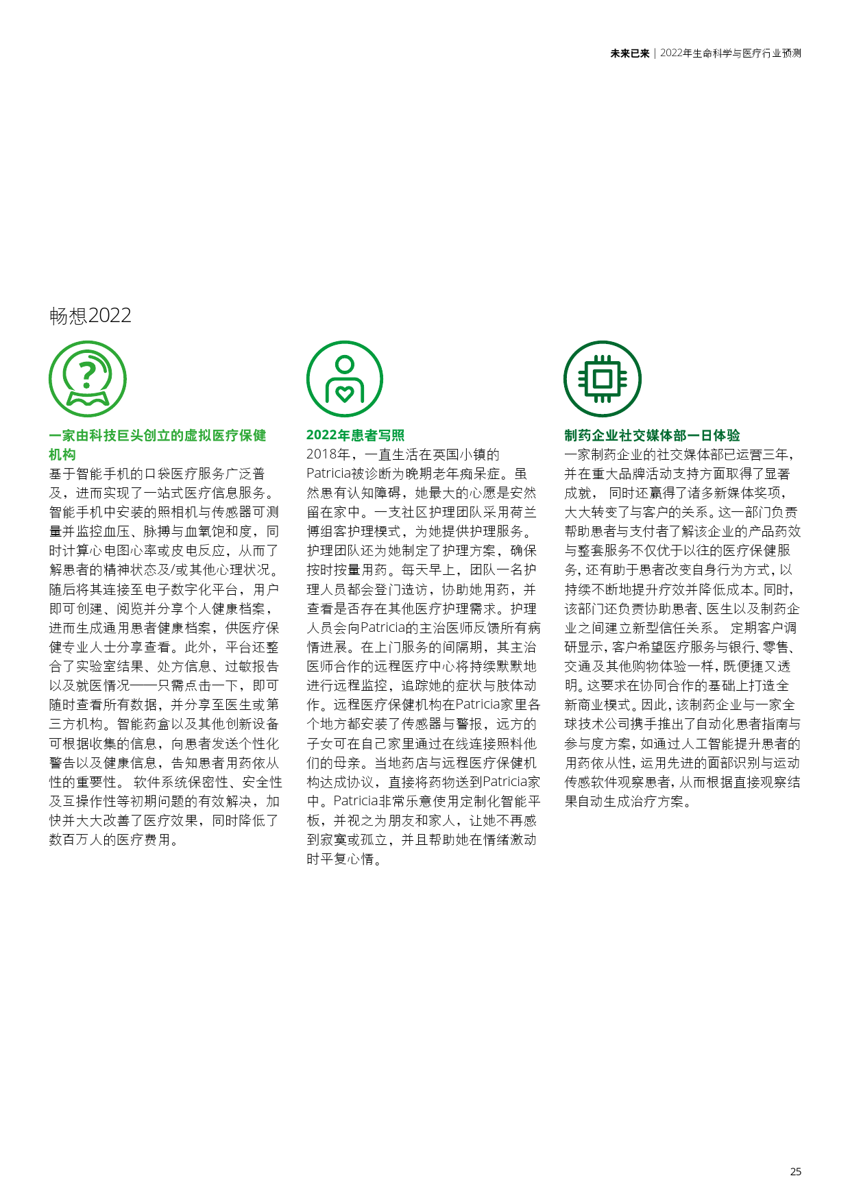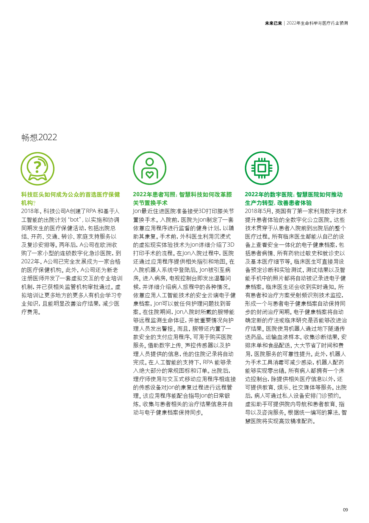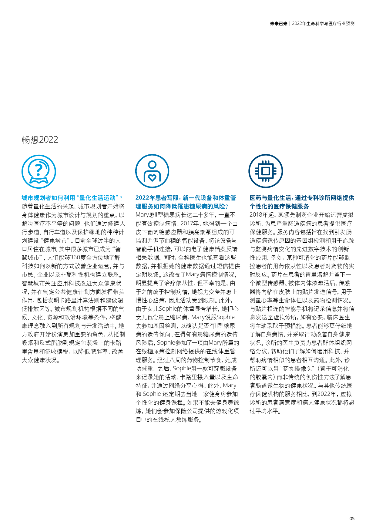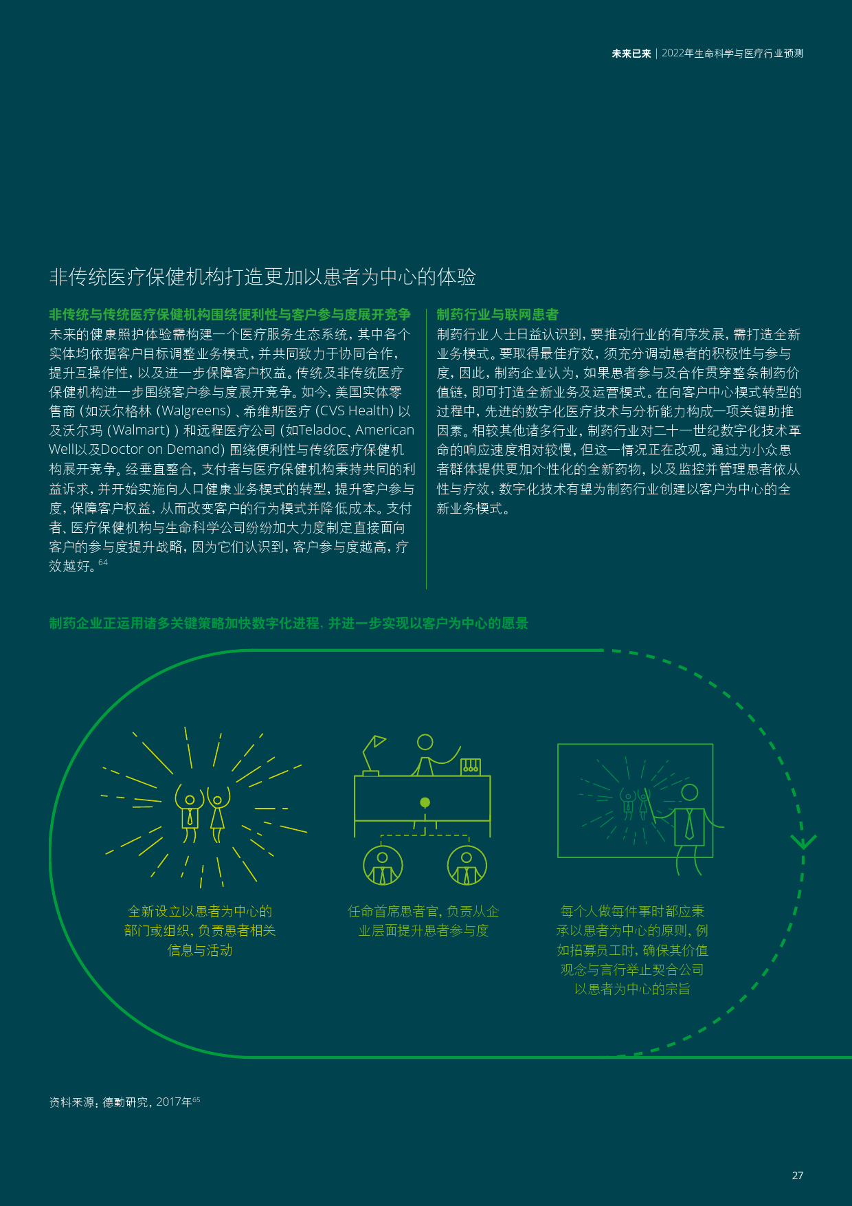 本报告回顾了2017年行业现状,并对2022年生命科学与医疗行业的发展格局提出六大预测。我们研究了各行业的主要趋势,需将解决的关键制约因素,以及目前可利用的迹象预测未来。我们还探讨了几项案例,用以证明患者角色的变化和患者体验的重要性,以及展示创新与新商业模式正在如何推动服务、系统和流程的转型。
