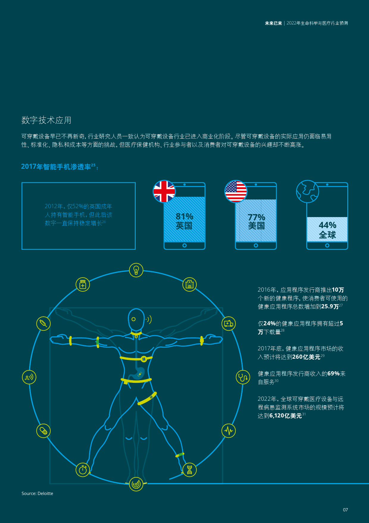 量化生活依然盛行,数字技术改变了医疗行业文化,新进入企业颠覆了服务提供模式。这些均是本报告的部分预测,如果将来成为现实,未来五年将呈现与2017年截然不同的医疗行业格局。