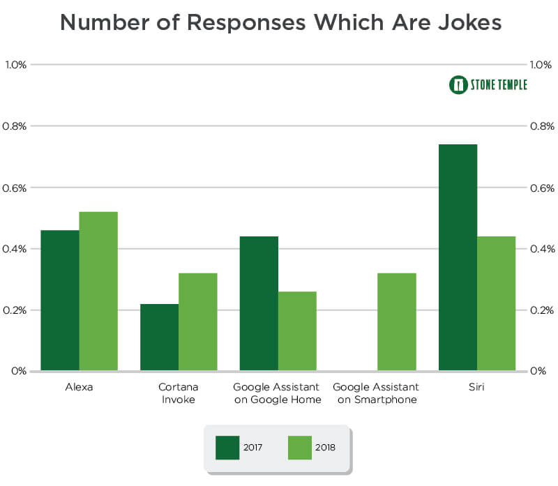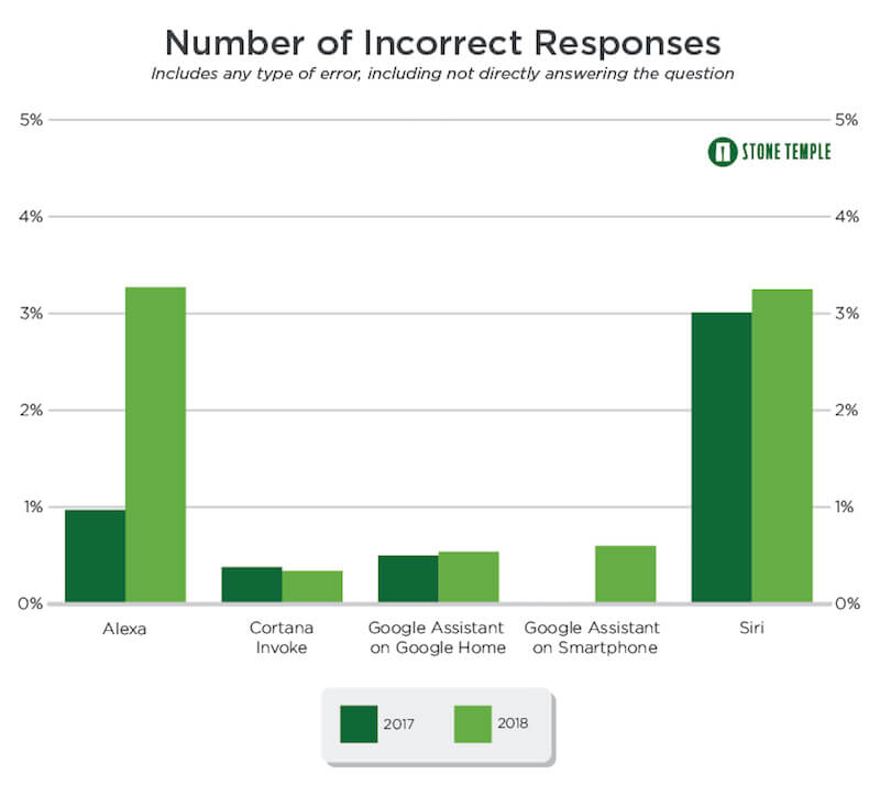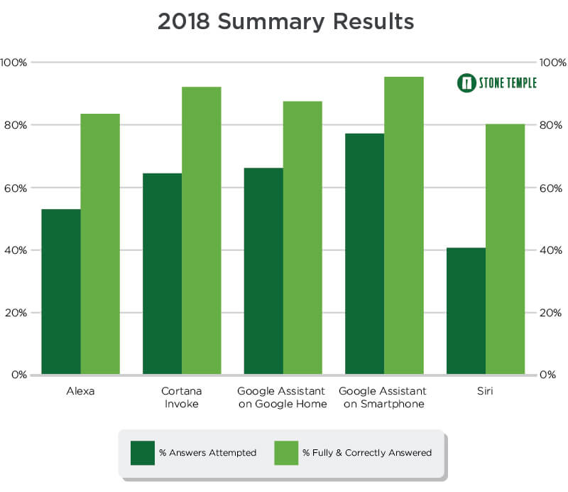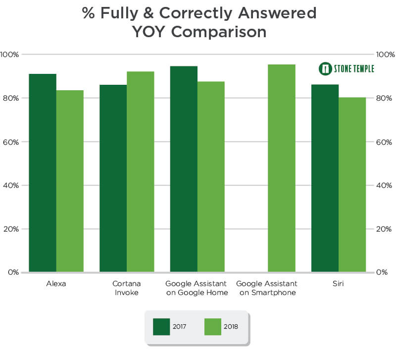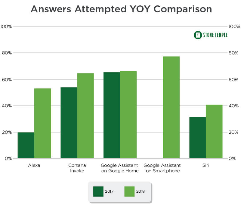 Stone Temple收集了4952个问题,希望了解哪个个人助手更聪明,并与2017年的调查结果进行了比较。