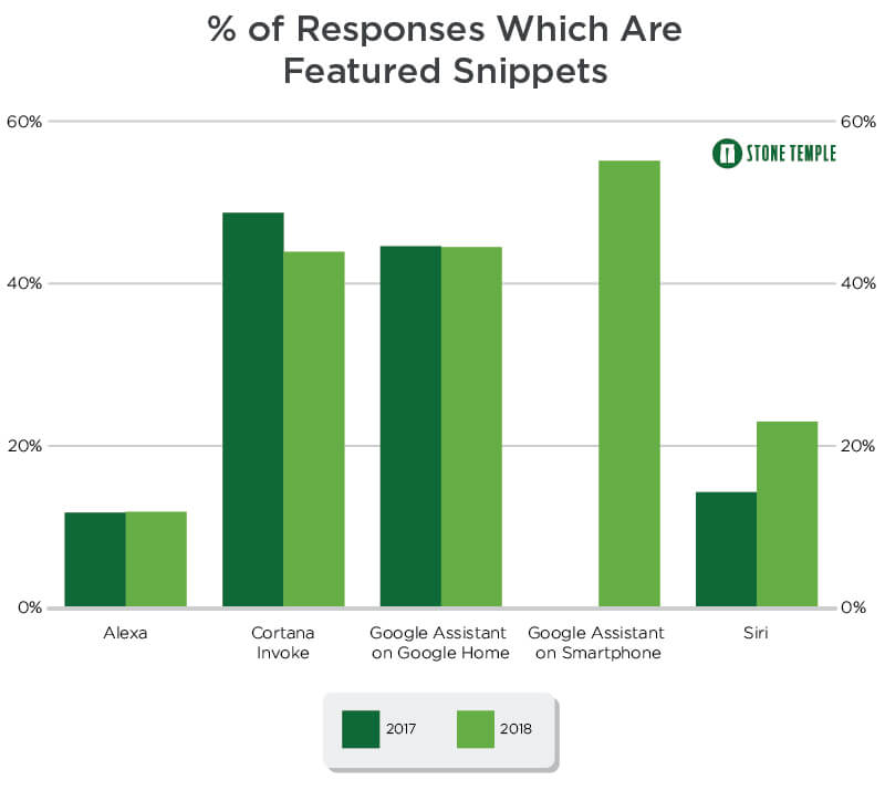Stone Temple还调查了精选摘要功能,Siri使用该功能从14.3%增长至23.0%,其他个人助手基本没什么改变。