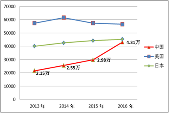 图9 2013-2017年全球四大卫星导航系统累计发射卫星数