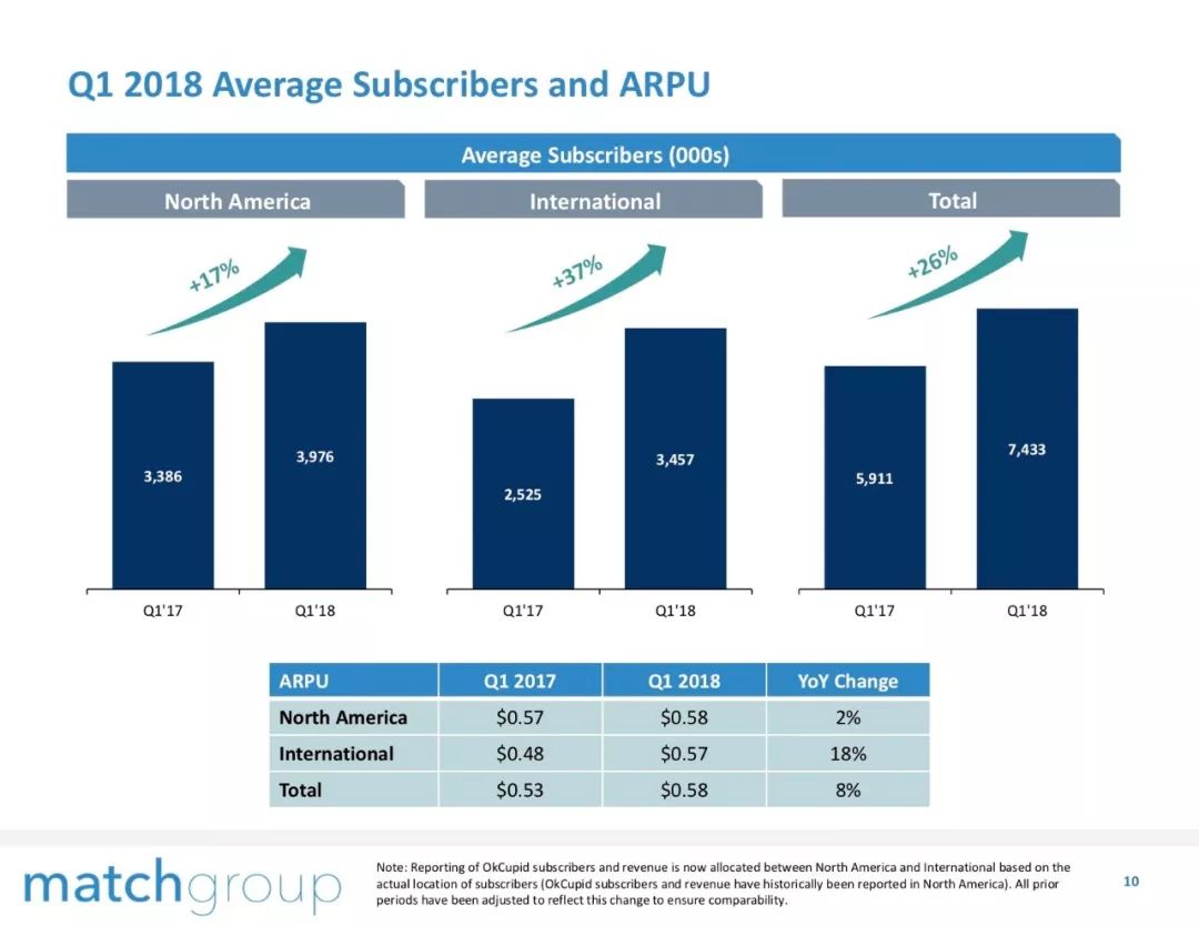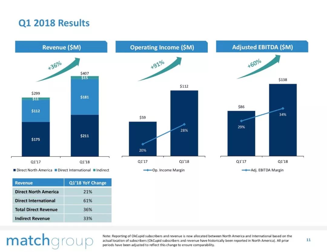 Match发布了1Q18的财报,根据财报,Match本季度总营收同比增长36%至4.07亿美元。其中北美市场直接营收同比增长21%,国际市场直接营收同比增长61%,间接营收同比增长33%。