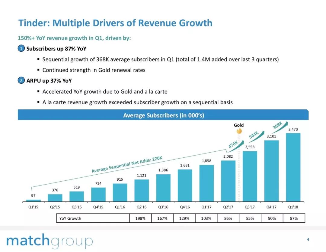公司旗下的Tinder(美国版探探)是驱动公司营收增长的明星业务,其他业务则保持平稳增长。1季度Tinder营收同比增长150%,其中付费会员数同比增长87%,季度净增36.8万,黄金会员续费率好于预期;ARPU同比增长37%,主要得益于黄金会员和La carte的增长。