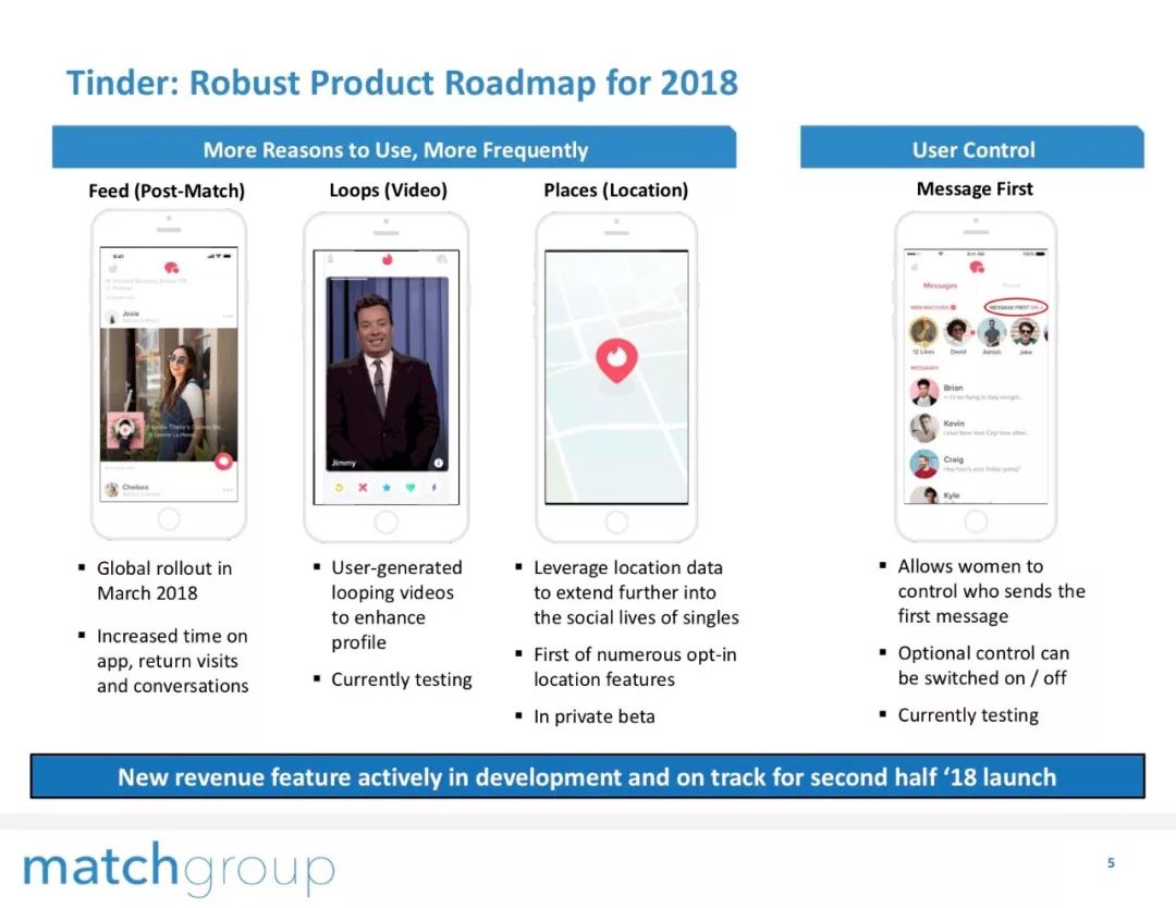 Tinder 2018年的产品路径主要侧重两个方向,一个是提高用户使用意愿和频次;第二个是增强用户控制,让女性用户可以决定谁最先发送消息。着重于提升用户使用频次的匹配后的FEED,LOOP,位置等功能的测试数据表现非常理想,这些功能逐渐向全球用户开放。