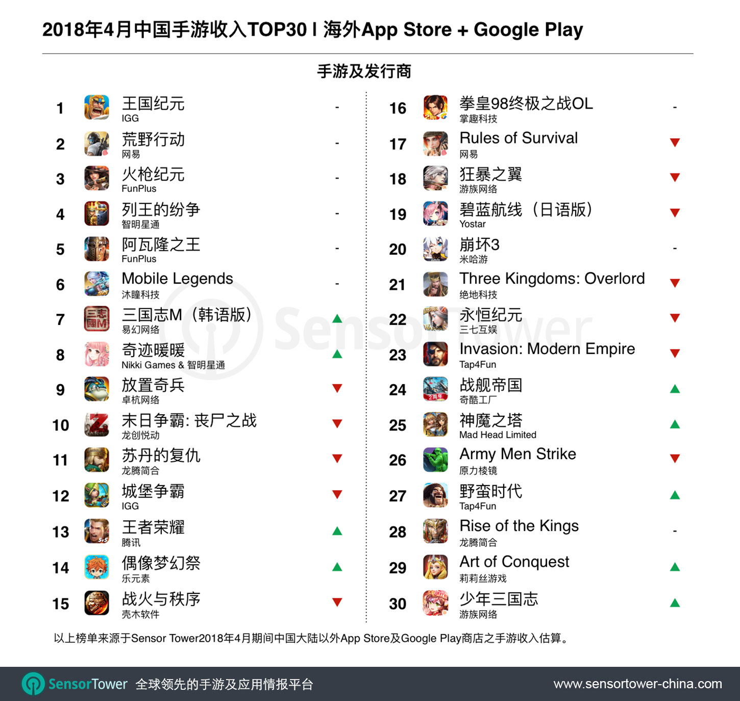根据对Sensor Tower商店情报平台最新数据的分析,这篇报告中揭露了2018年4月期间,哪些国产手游作品在中国大陆以外的海外App Store及Google Play商店中,出海吸金量及下载量名列前茅。我们的数据及分析揭示,易幻网络专门针对韩国市场所推出的《三国志M》收入飙增,从3月份的第25名冲入前十,拿下上月出海吸金榜第七名的成绩;而相对3月份来看,收入TOP30榜单上的前六强排名全部不变,《王国纪元》继续占领冠军位置。下载量角度,腾讯吃鸡巨作《PUBG Mobile》保持第一的排名。