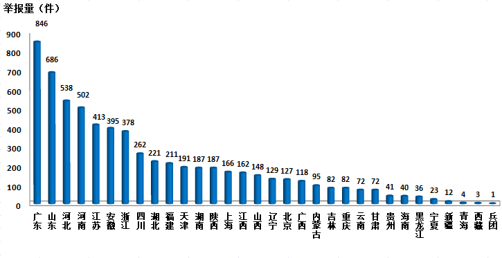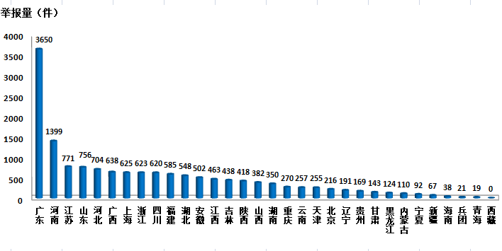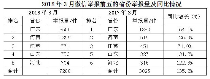 大数据统计显示,微信举报环比、同比增幅均超过一倍。3月,平台共接到微信举报15445件,相比上月增加9219件,环比增长148.1%;相比去年同期增加9067件,同比增长142.2%。从地区来看,广东和河南两省公众使用微信举报相对频繁,举报数量合计占全国总数的32.7%。