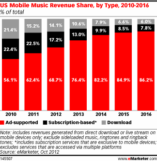 eMarketer最近数据显示,广告收入在移动音乐收入中所占的比重已经很大,然而明年还会继续增长,eMarketer预测,到2016年广告收入将占到美国移动音乐市场总收入的86%。