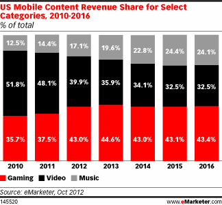 但是,与视频和游戏相比,音乐收入在移动内容总收入中所占的比重依然是最小的。虽然这一比重到2015将比现在高出7个百分点。游戏所占的比重比较大,2012年占总收入的43%,在可预见的将来这一数字会有小小波动。而视频所占的比重将会减少,2010年还占到了50%以上,而到2016年将降到不足30%。今年,移动游戏收入将达到10.8亿美元,而视频收入将达到10亿美元。