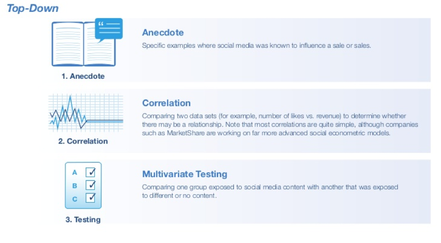 为了更好地说明组织机构应如何测量社会化媒体营销的收益,奥特米特集团(Altimeter Group,商业咨询公司)总结了6项自上而下和自下而上的基本方法,并且整理了3个研究案例。许多现实迹象表明,以一种全面的视角,将自上而下和自下而上的方法融合在一起测量,能达到最好的效果。