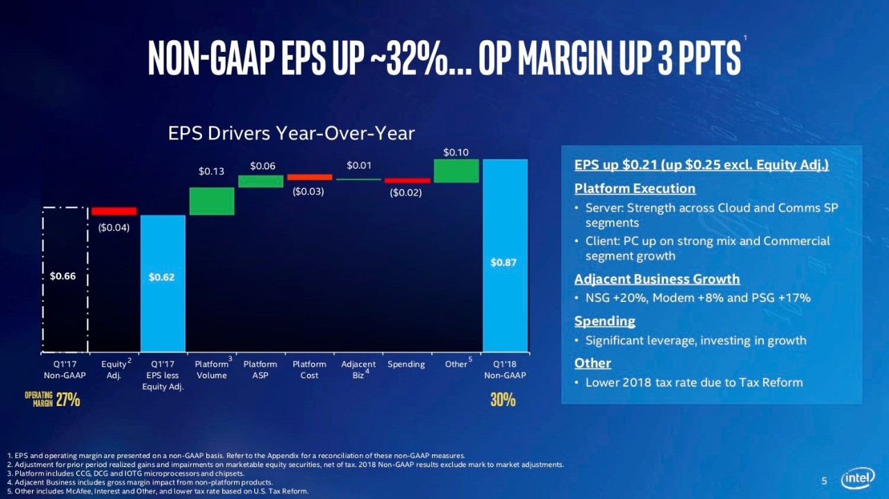 1季度公司营收为161亿美元,同比增长13%,主要受益于数据中心业务的强劲增长。数据中心业务的高速增长,运营利润率的提升,以及更低的税率使得公司整体Non-GAAP EPS达到0.87美元,同比增长32%。