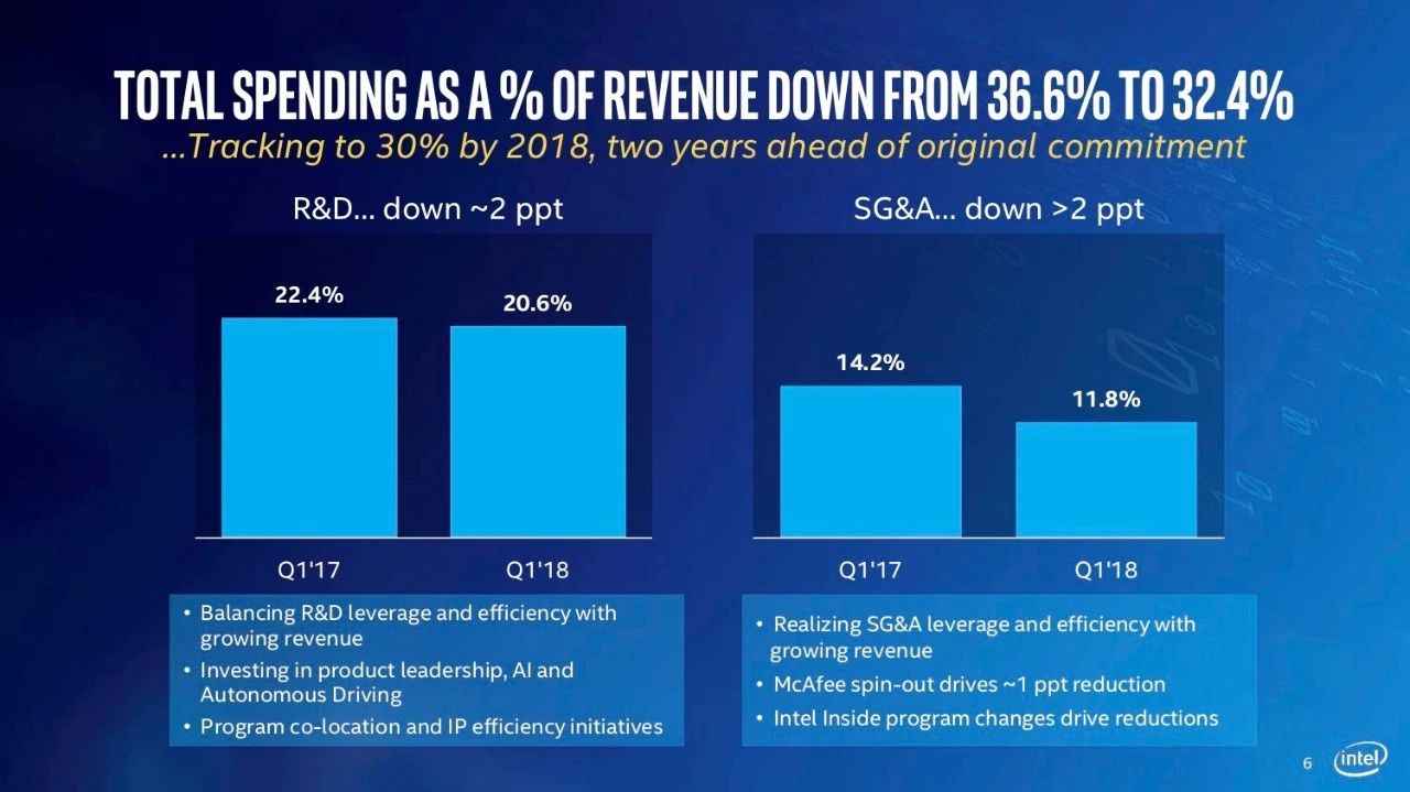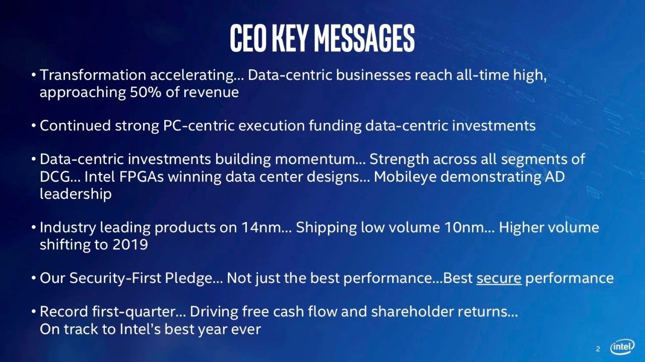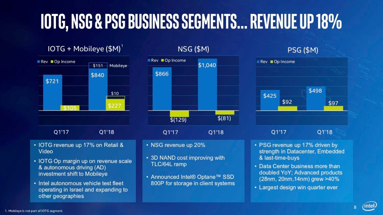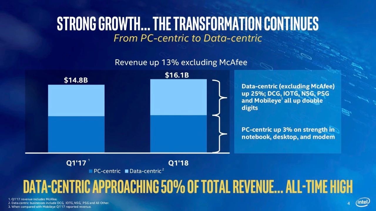 公司继续执行从PC中心向数据中心迈进的战略,总营收从去年的148亿美元增至161亿美元。数据中心业务同比增速达到25%,DCG,IOTG,NSG,PSG和Mobileye部门均实现两位数的营收增长。传统的PC中心业务同比增长3%,主要因为笔记本,桌面电脑和Modem市场保持稳健。