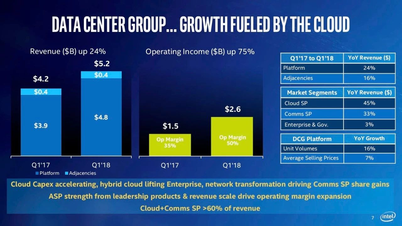 数据中心业务群受益于云计算驱动,营收同比增长24%至52亿美元。旗下各业务模块均保持两位数增长,业务部门销量增长16%,平均价格提升7%。这也使得数据中心业务群的运营利润从去年同期的15亿美元上升至26亿美元,运营利润率从35%提升至50%。