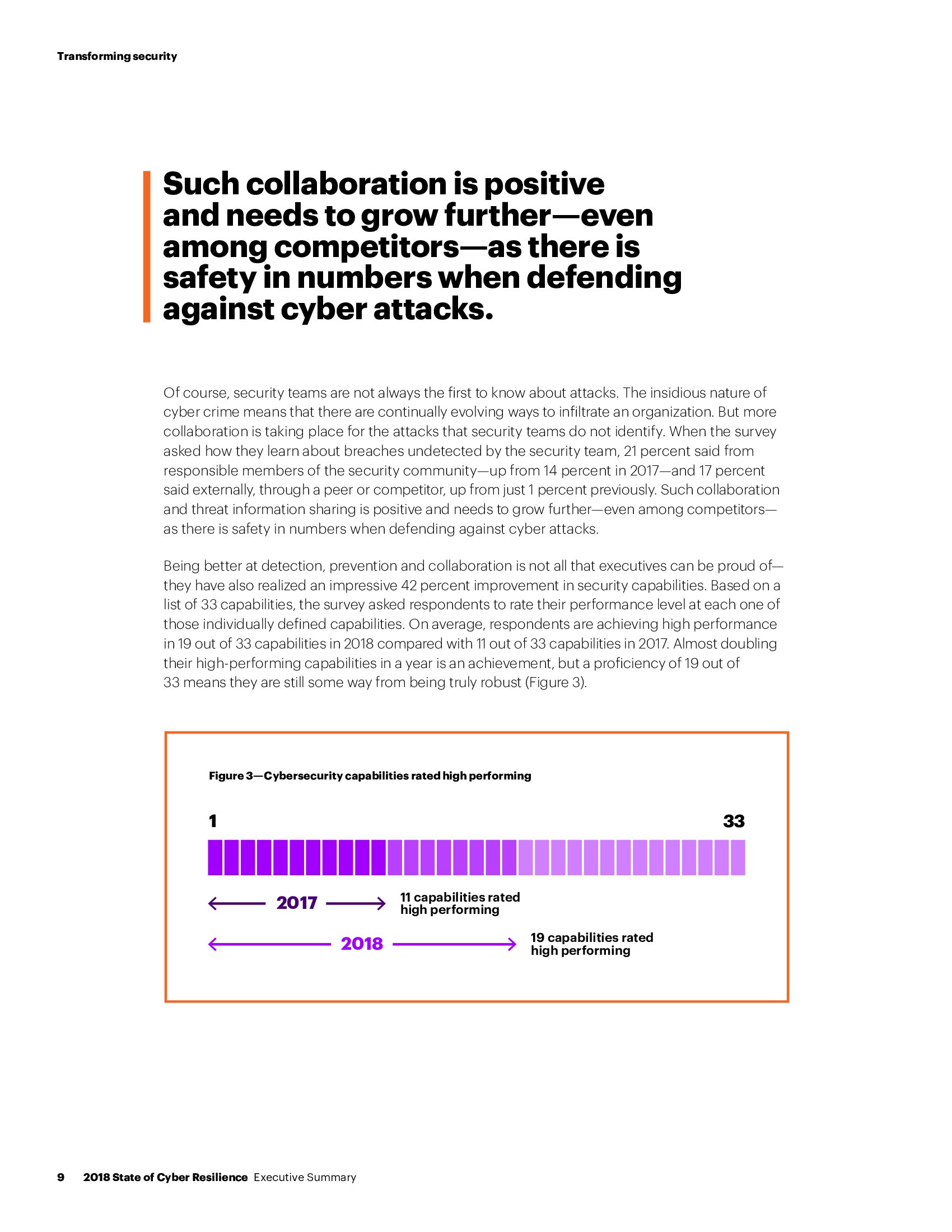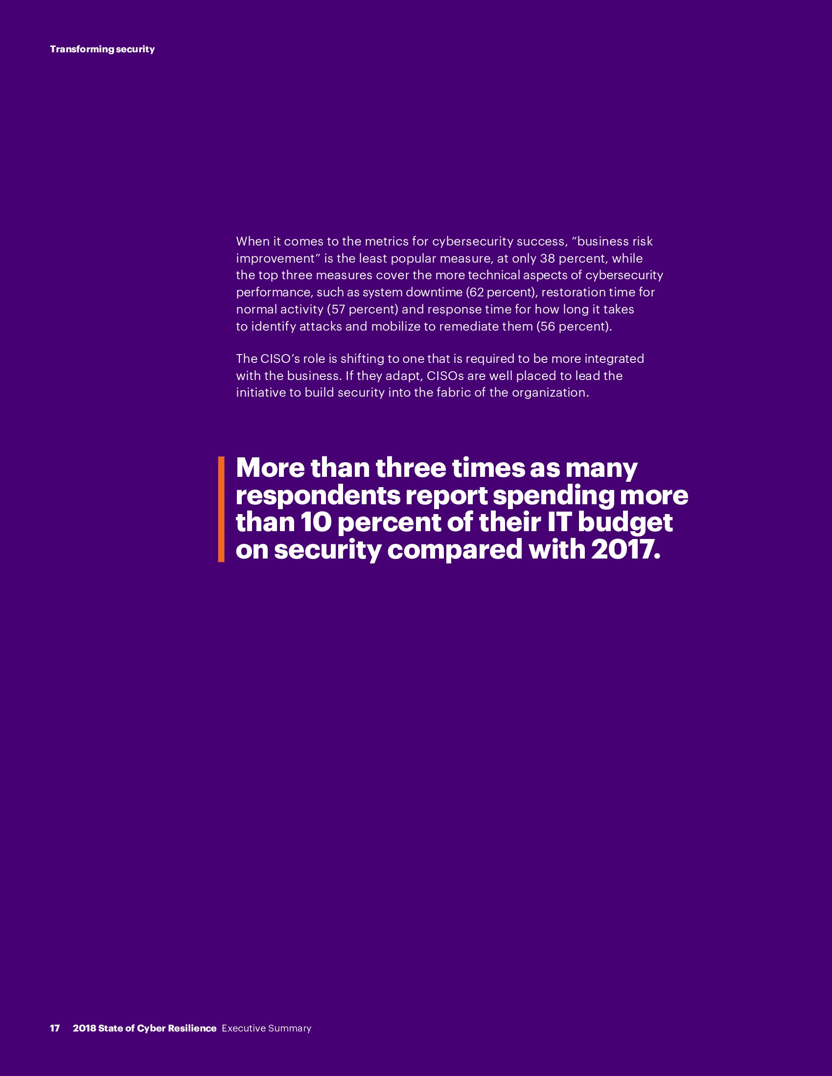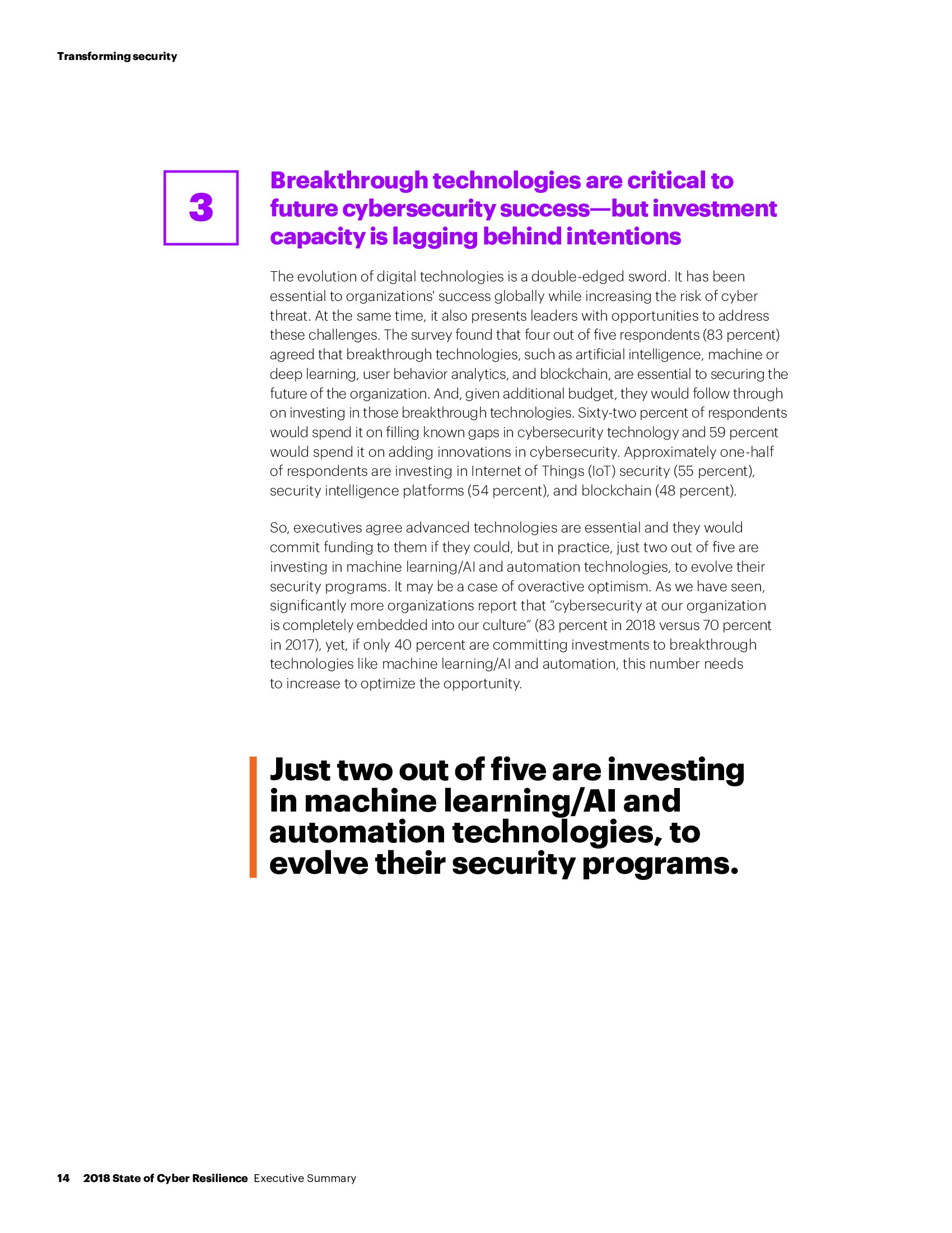 技术是解决方案的重要组成部分。 83%的受访者认为突破性技术,如人工智能、机器深度学习、用户行为分析和区块链,对于确保企业未来网络防卫至关重要。近年来,越来越多的支持和网络安全方面的投资开始带来收益。