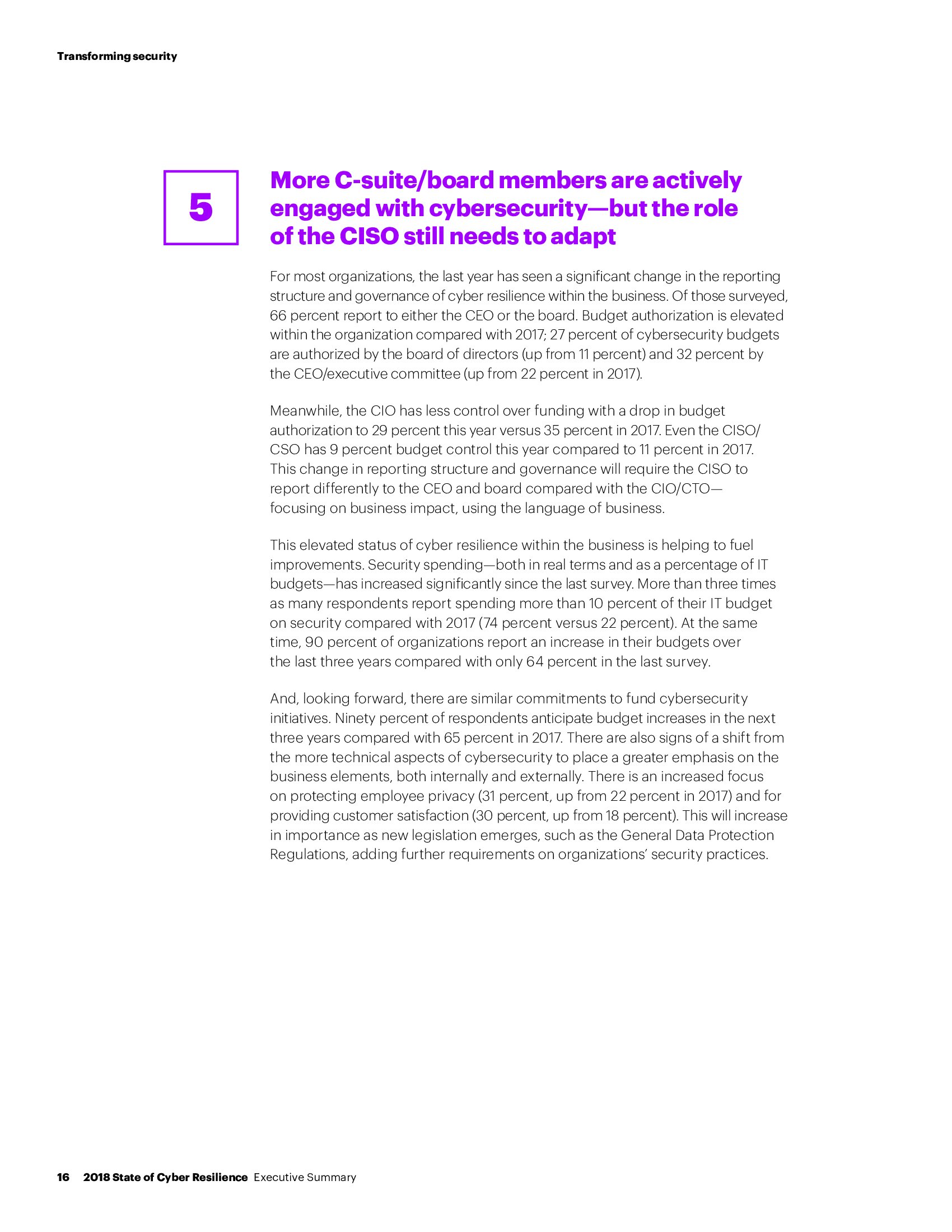 高管和董事会在网络安全方面更加活跃,但必须拥抱CISO(首席信息安全官)的角色。27%的网络安全预算由董事会授权,32%由CEO授权。CISO的角色则需要发展,并与业务融合。