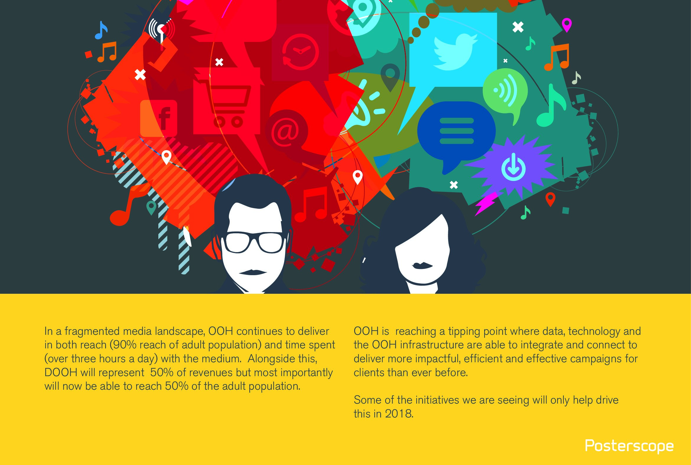 Posterscope发布了“2018年户外广告(OOH)预测”报告,户外广告在接触量和时间方面仍然有优势,接触90%的成年人,每天超过3小时。数字户外广告占50%的收入,接触50%的成年人。