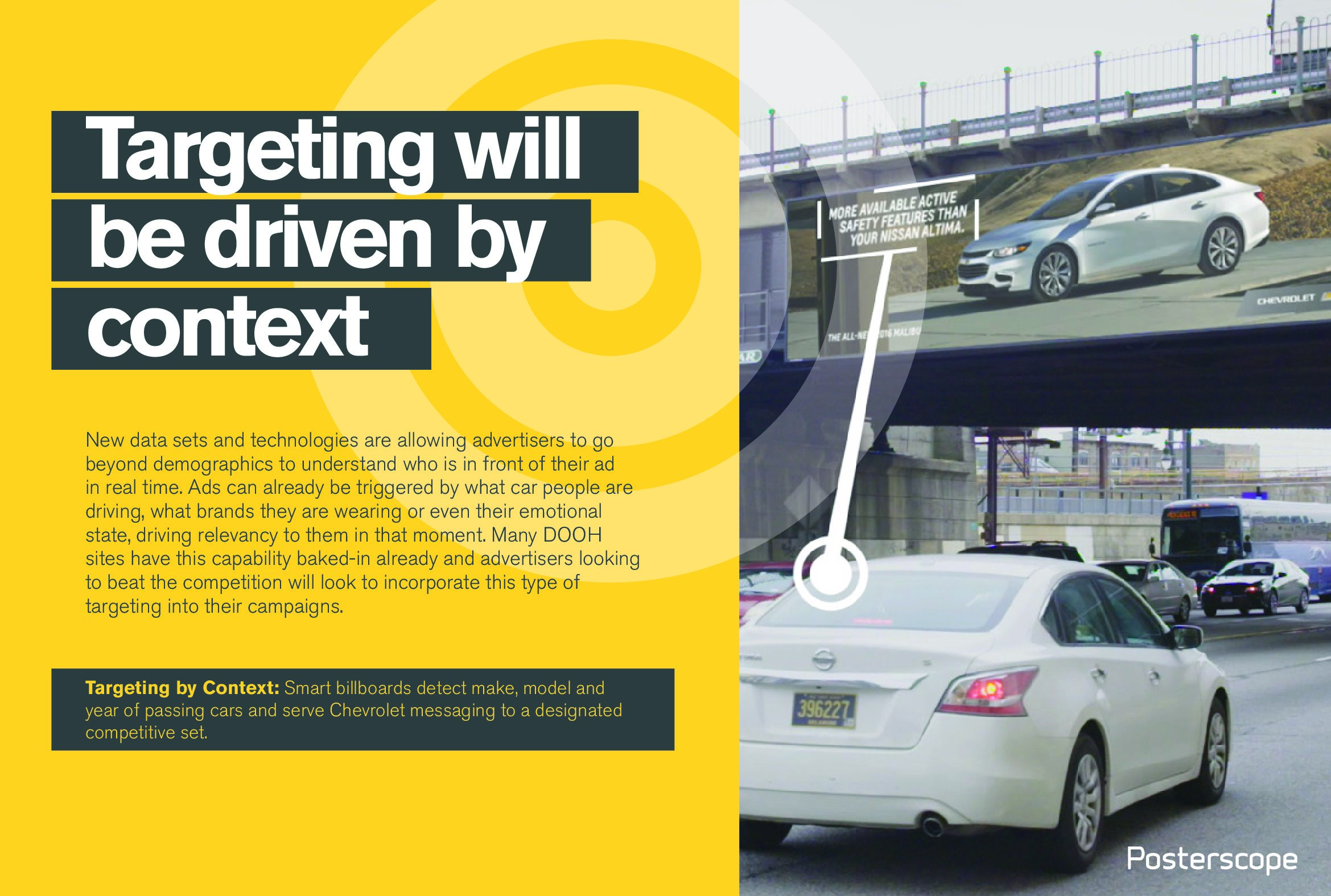 - 情境推动定向。新的数据集和技术使广告客户能够超越人口统计数据,实时了解谁在OOH广告前面。广告可以通过人们驾驶什么车,穿着什么品牌,甚至是他们的情绪状态,在某个时刻发送具有相关性的广告,许多DOOH已经具备了这种能力。