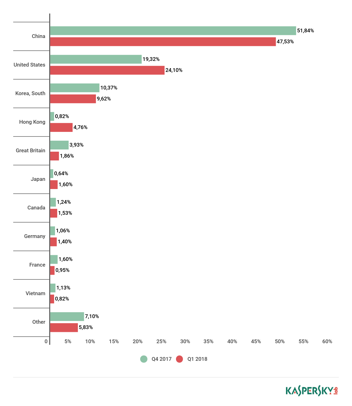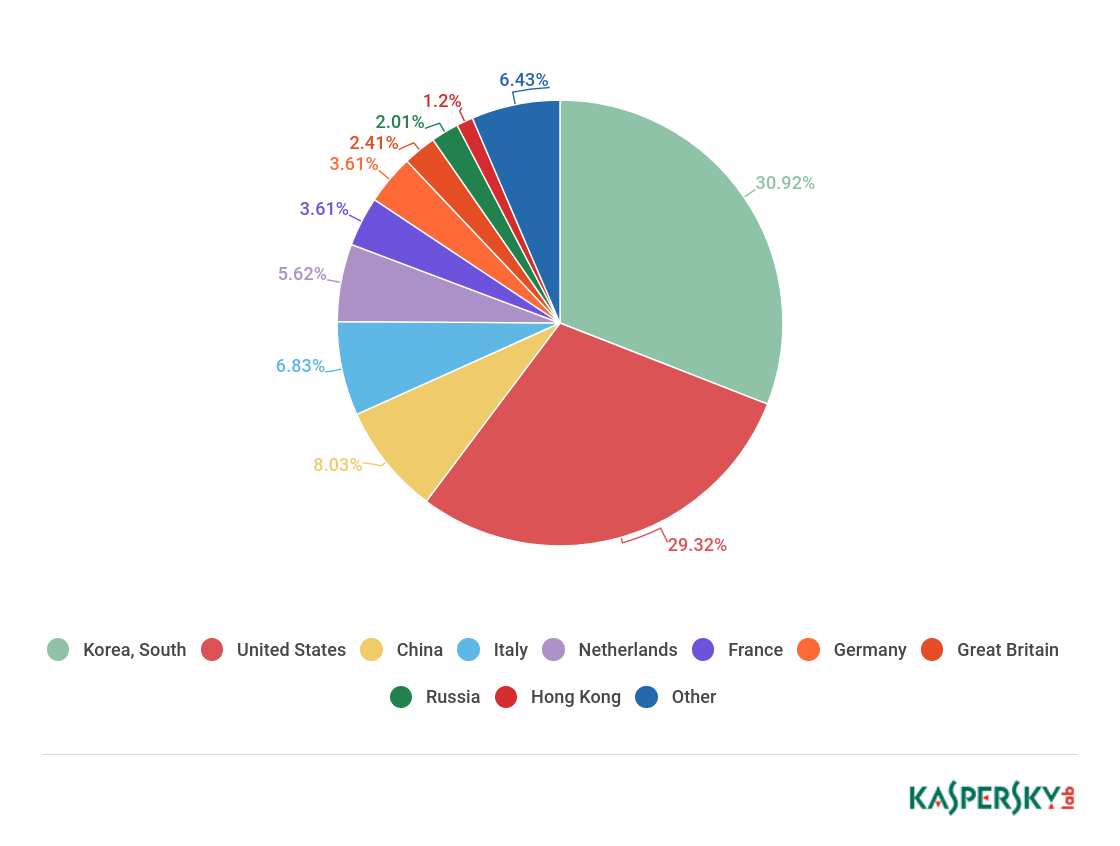 从攻击目标来看,中国依然排在首位,尽管份额从51.84%下降至47.53%。美国仍然排在第二位,份额从19.32%上升至24.10%。韩国以9.62%的份额排在第三位。