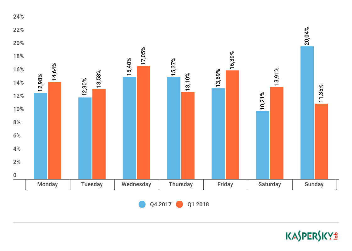 从一周来看,最平静的是星期日,仅占攻击数量的11.35%。