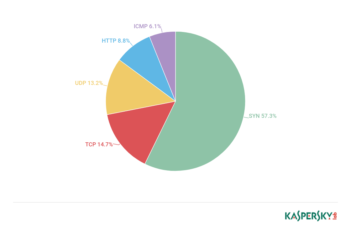 SYN-DDOS攻击的份额从55.63%增长至57.3%。ICMP攻击的份额几乎翻一番,从3.4%增长至6.1%。