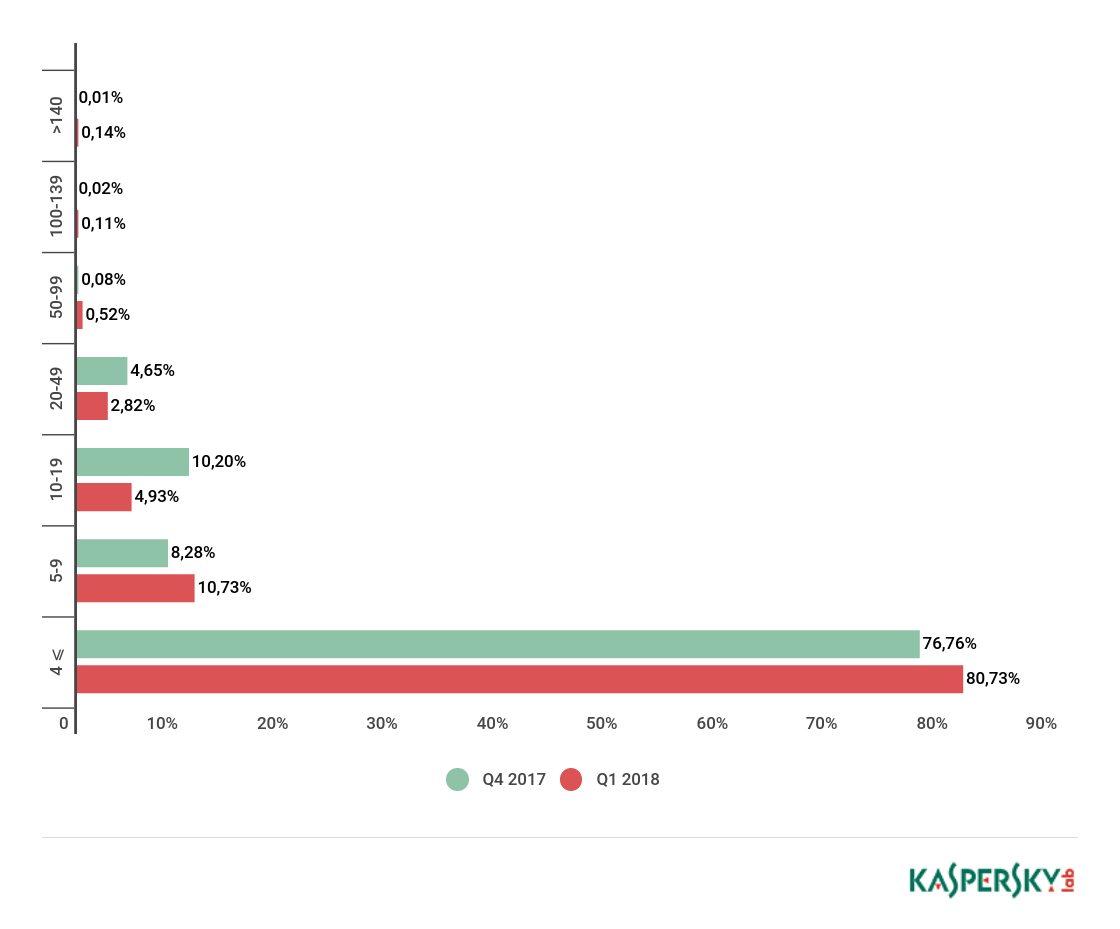 卡巴斯基实验室发布了第一季度全球DDoS攻击情况。与以往一样,绝大多数的攻击发生在前十个国家(95.14%)。